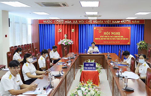 Chiều 9-7, Tổng cục Thuế tổ chức hội nghị trực tuyến toàn quốc sơ kết công tác thuế 6 tháng đầu năm, triển khai nhiệm vụ, giải pháp công tác thuế 6 tháng cuối năm. Tại điểm cầu Khánh Hòa, lãnh đạo Cục Thuế tỉnh và các phòng chức năng, chi cục thuế trên địa bàn tỉnh tham dự hội nghị.