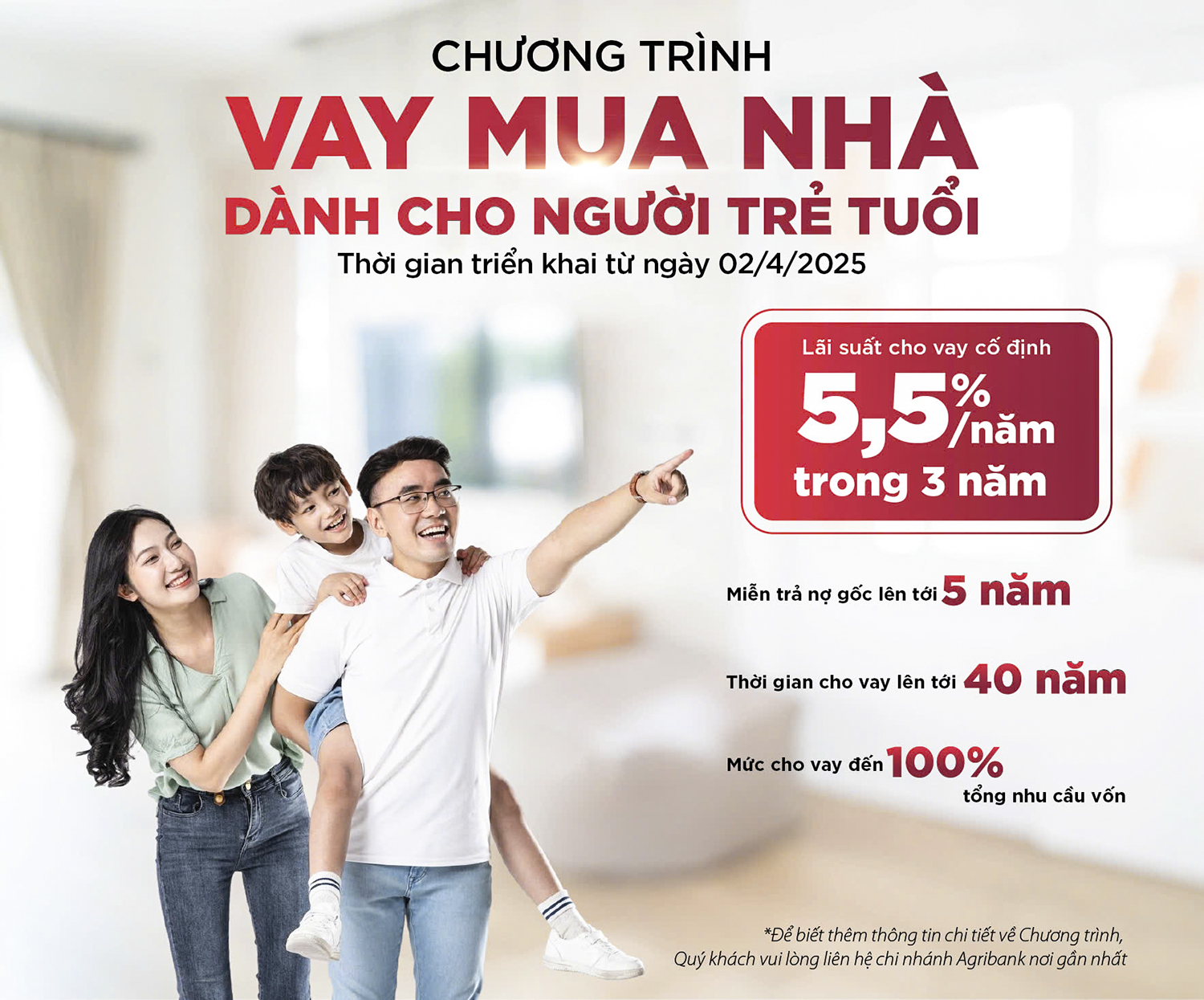 Với mong muốn hỗ trợ ngày càng nhiều khách hàng tiếp cận nguồn vốn vay ưu đãi, đặc biệt là nhóm khách hàng trẻ tuổi (dưới 35 tuổi) để "an cư lạc nghiệp", phát triển kinh tế một cách bền vững, Agribank dành 10.000 tỷ đồng triển khai Chương trình cho vay mua nhà ở đối với khách hàng trẻ tuổi với chính sách lãi suất, phí ưu đãi và các sản phẩm dịch vụ mang lại giải pháp tài chính toàn diện giúp người trẻ quản lý tài chính, hiện thực hóa mong muốn sở hữu ngôi nhà ước mơ, ổn định cuộc sống. Theo đó, từ ngày 2-4 đến hết ngày 31-12-2025, khách hàng cá nhân là công chức, viên chức, người lao động dưới 35 tuổi có nhu cầu vay vốn Agribank để mua nhà sẽ được sử dụng chính căn nhà dự định mua làm tài sản bảo đảm.