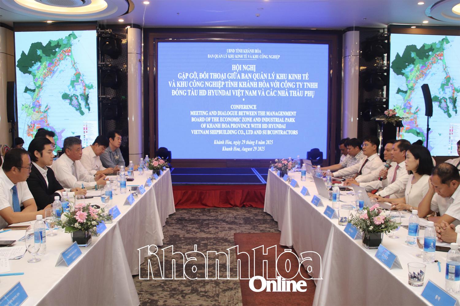 Ngày 29-8, Ban Quản lý Khu kinh tế (KKT) và Khu công nghiệp (KCN) tỉnh Khánh Hòa tổ chức hội nghị gặp gỡ, đối thoại với Công ty TNHH Đóng tàu HD Hyundai Việt Nam và các nhà thầu phụ. Qua đó nhằm tập trung hỗ trợ, tháo gỡ khó khăn, góp phần thực hiện mục tiêu phát triển công nghiệp của tỉnh.