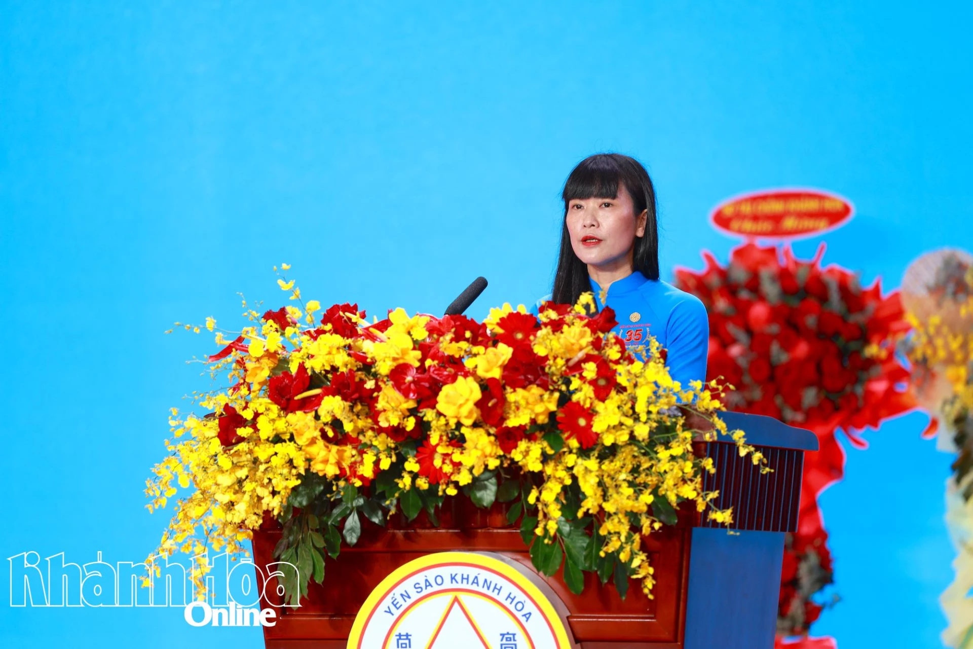 | Chủ tịch Hội đồng thành viên Công ty Yến sào Khánh Hòa Trịnh Thị Hồng Vân phát biểu ôn lại chặng đường 35 năm phát triển. |