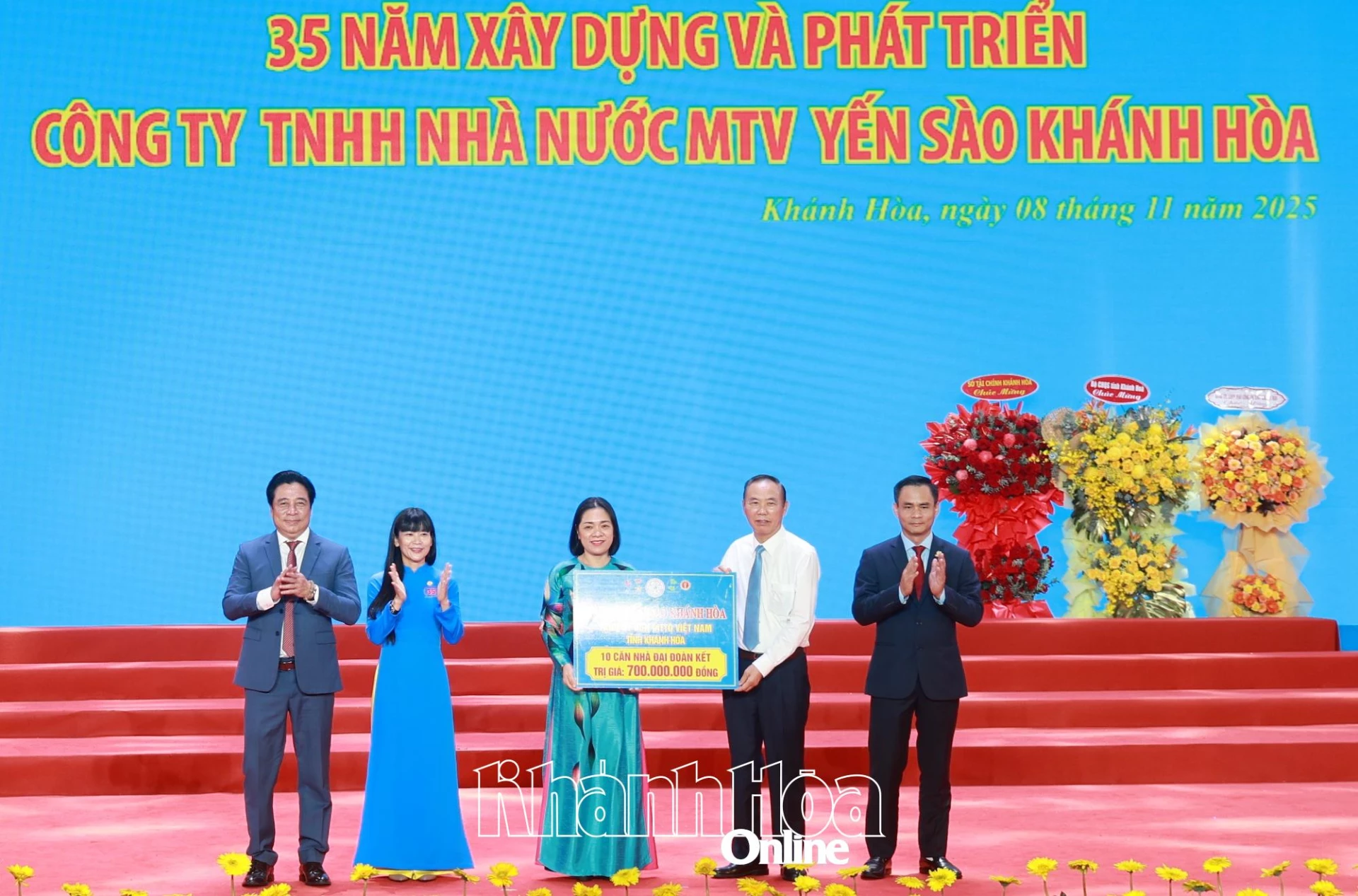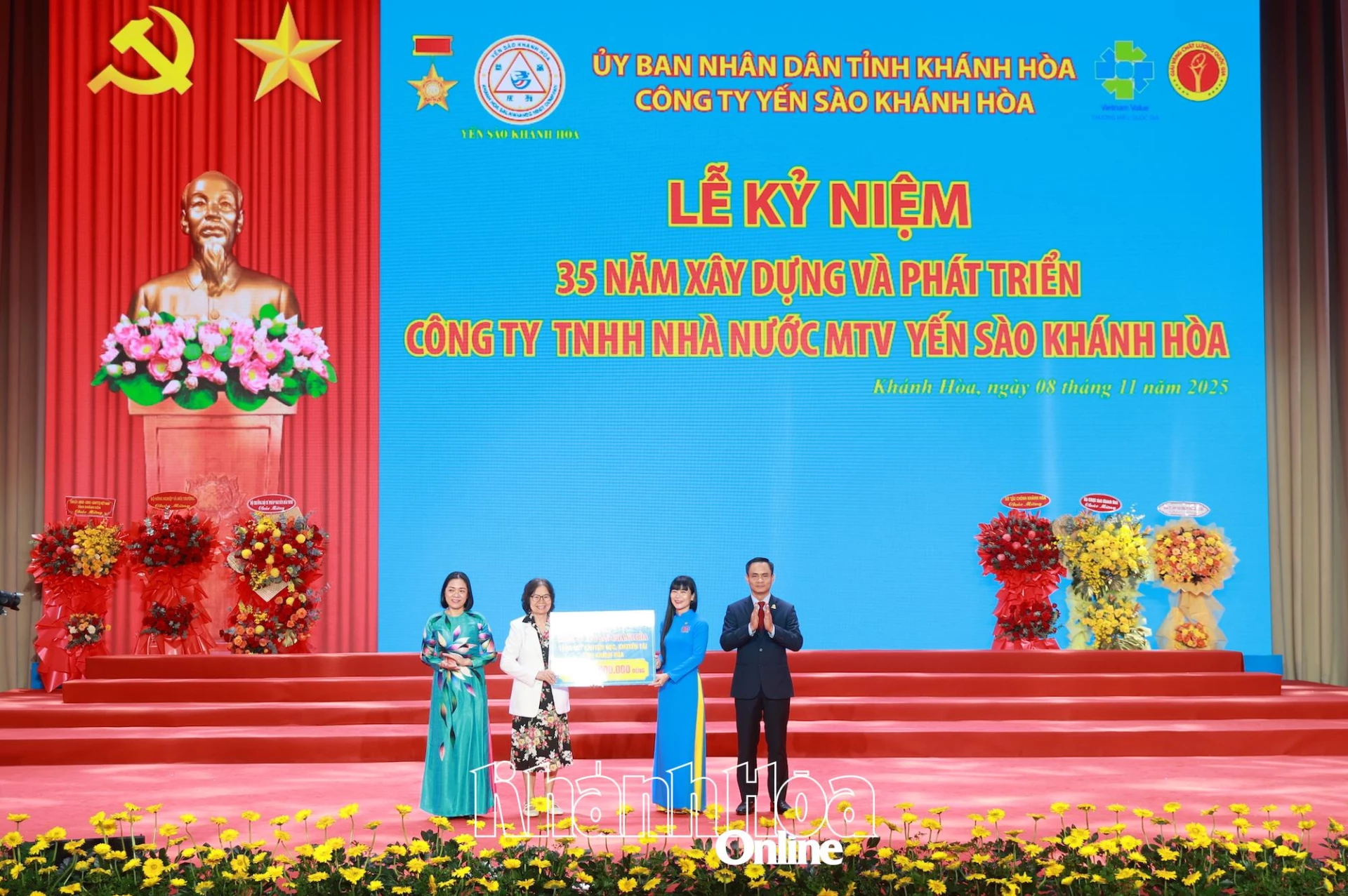 Tại buổi lễ, Công ty Yến sào Khánh Hòa đã ủng hộ 1 tỷ đồng để hỗ trợ đồng bào các tỉnh khắc phục hậu quả bão lũ; tặng 35 căn nhà Đại đoàn kết cho các hộ gia đình có hoàn cảnh khó khăn trên địa bàn tỉnh, thể hiện tấm lòng sẻ chia và trách nhiệm với cộng đồng; ủng hộ 200 triệu đồng vào Quỹ Khuyến học, Khuyến tài tỉnh. Dịp này, công ty trao 33 Kỷ niệm chương 35 năm cho các cá nhân đã có nhiều đóng góp tiêu biểu cho sự phát triển của Yến sào Khánh Hòa.