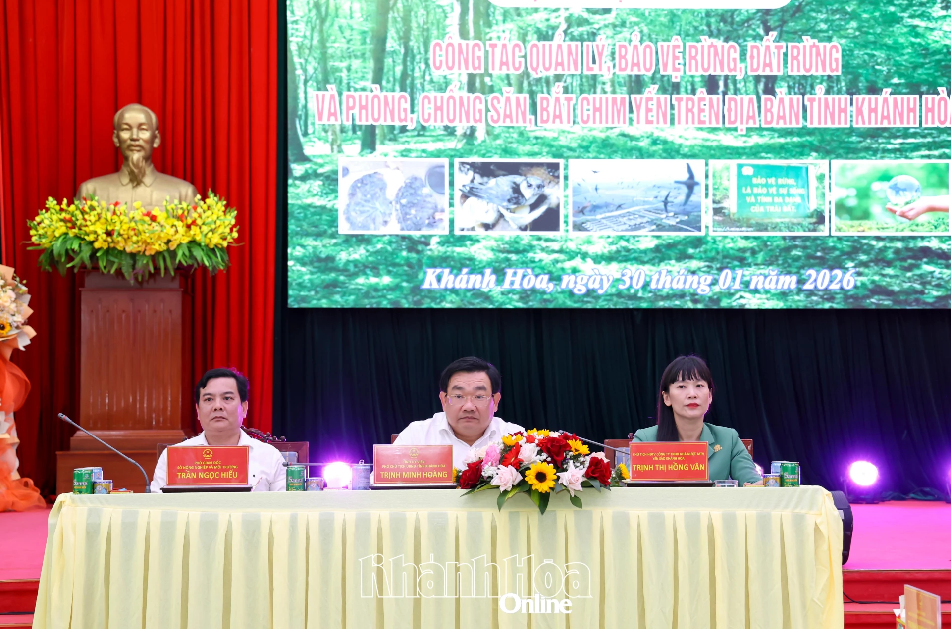 Chiều 30-1, UBND tỉnh Khánh Hòa tổ chức hội nghị chuyên đề về công tác quản lý, bảo vệ rừng, đất rừng và phòng, chống săn, bắt chim yến trên địa bàn tỉnh. Đồng chí Trịnh Minh Hoàng - Phó Chủ tịch UBND tỉnh; ông Trần Ngọc Hiếu - Phó Giám đốc Sở Nông nghiệp và Môi trường; bà Trịnh Thị Hồng Vân - Chủ tịch Hội đồng thành viên Công ty TNHH Một thành viên Yến sào Khánh Hòa chủ trì hội nghị. Tham dự có đại diện Bộ Nông nghiệp và Môi trường; các sở, ban, ngành, địa phương trong tỉnh.