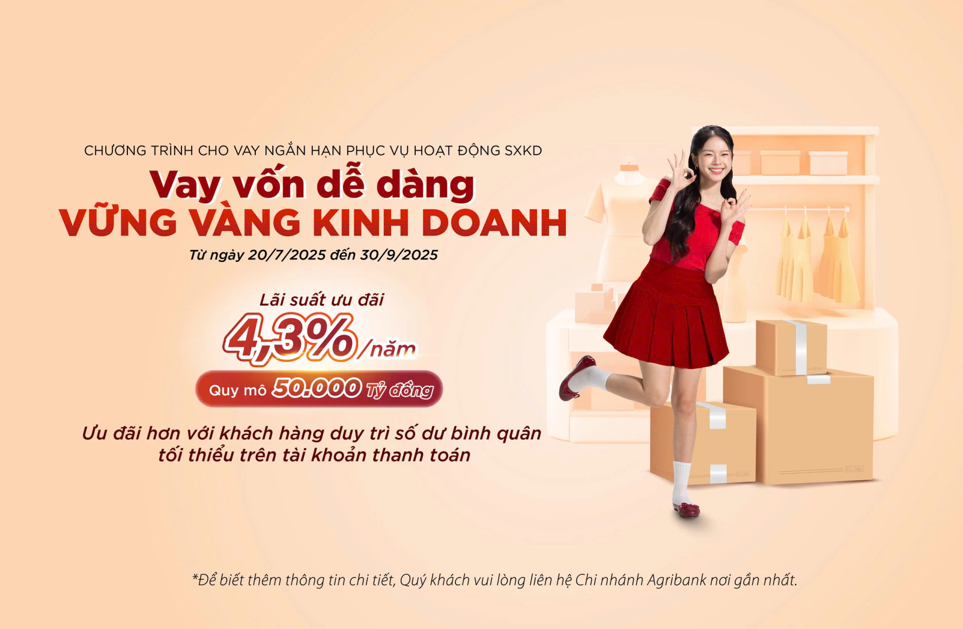 Cùng với đó, Agribank còn triển khai chương trình cho khách hàng cá nhân vay ngắn hạn phục vụ hoạt động sản xuất kinh doanh với quy mô 50.000 tỷ đồng. Thời gian triển khai chương trình từ ngày 20-7-2025 đến hết ngày 30-9-2025. Agribank sẽ cho vay từng lần, cho vay theo hạn mức, cho vay theo hạn mức thấu chi trên tài khoản thanh toán. Đặc biệt, khách hàng cá nhân vay vốn phục vụ hoạt động sản xuất kinh doanh theo chương trình này được áp dụng mức lãi suất cho vay thấp hơn tối đa 0,5%/năm so với sàn lãi suất cho vay phục vụ sản xuất kinh doanh thông thường. Cụ thể, kỳ hạn đến 3 tháng có lãi suất từ 4,3%/năm; trên 3 tháng đến 6 tháng từ 4,5%/năm; trên 6 tháng đến 12 tháng từ 5%/năm.