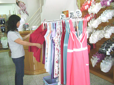 Bên cạnh các hãng thời trang nổi tiếng, váy ngủ tại cửa hàng thời trang Bonjour (đường Phan Bội Châu, Nha Trang) cũng khá phong phú với kiểu dáng bắt mắt. Màu sắc và kiểu dáng đáp ứng sở thích và cá tính của mọi lứa tuổi, từ những màu sắc nóng bỏng, rực rỡ, trẻ trung cho đến họa tiết hoa văn xinh xắn, thanh nhã trên nền vải sa-tanh, voan, thun lạnh mềm mại… Điểm nhấn cho những chiếc váy này là đường viền điệu đà trang trí trên cổ áo, ngực và chân váy. Một nhân viên bán hàng tại cửa hàng thời trang Bonjour cho biết: “Về kiểu dáng, váy ngủ năm nay không thay đổi nhiều nhưng màu sắc, hoa văn phong phú và đa dạng hơn. Khách hàng đến với cửa tiệm đủ lứa tuổi. Đối với khách hàng là người Việt thường thích những bộ váy hoa văn đơn giản, màu sắc nhã nhặn như: hồng nhạt, xanh, trắng… Còn khách hàng là người nước ngoài thường thích những bộ váy ngủ hoa văn sặc sở”. So với các hãng nổi tiếng, thời trang Bonjour giá mềm hơn, chỉ từ 120.000 - 160.000 ngàn đồng/sản phẩm, tùy chất liệu vải. Đặc biệt, hãng thường xuyên có chương trình khuyến mãi giảm giá cho khách hàng. Chị Minh Tuấn (đường Lê Hồng Phong - TP. Nha Trang) chia sẻ: “Tôi thường mặc những chiếc váy ngủ hai dây, cổ hình trái tim, sử dụng chất liệu voan, sa-tanh phối ren phần ngực hoặc thắt nơ gợi cảm. Thời trang đồ ngủ của hãng Bonjour không chỉ giá “mềm”, chất liệu thoáng mát mà còn thiết kế khá gợi cảm. Nhân viên bán hàng rất nhiệt tình và cởi mở, tư vấn tỉ mỉ từ cách chọn đồ cho đến chọn kiểu phù hợp”.