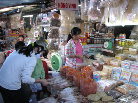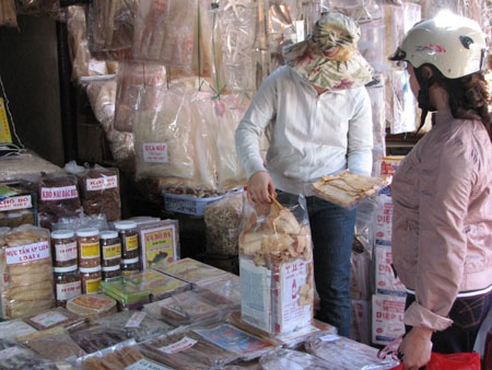 Chị bạn tôi đến Nha Trang du lịch và được người quen giới thiệu mặt hàng mực tẩm ăn liền rất ngon, không mất công chế biến nên ngỏ ý muốn mua về làm quà. Sau một hồi dạo quanh chợ Đầm, chị phàn nàn, hầu hết mực đều đựng trong các hũ thủy tinh lớn không đảm bảo vệ sinh hoặc đóng hộp sơ sài, không đề nơi sản xuất, bán không đúng giá niêm yết. Mức giá mực tẩm niêm yết phổ biến từ 350 - 400 ngàn đồng/kg mực loại 1 (mực lớn, không có đầu mực), 280 - 300 ngàn đồng/kg mực tẩm loại nhỏ, có đầu mực. Tuy nhiên, trong bối cảnh các sạp hàng đua nhau cạnh tranh về giá để lôi kéo khách, người mua có thể “mặc cả” giảm được 60 - 80 ngàn đồng/kg. Trả lời thắc mắc: “Làm sao để biết đây không phải là mực “Trung Quốc”, chị Loan, chủ sạp số 37 chợ Đầm khẳng định: “Hàng của các cơ sở ở Nha Trang sản xuất có uy tín lâu năm. Bây giờ, ai bán mực Trung Quốc là ngay lập tức bị tẩy chay. Em cứ nếm thử thì biết, hàng Nha Trang còn mới nguyên, ngon không chê vào đâu được”.