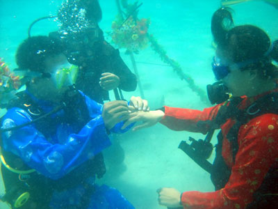 | Một đôi uyên ương đang thực hiện nghi thức trao nhẫn cưới dưới nước. |