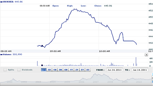Đến 10h, Vn-Index chỉ còn tăng 5,66 điểm và tụt xuống dưới mốc 450 điểm. BVH tiếp tục giữ giá sàn. FPT, HPG, ITA, MSN, SSI, VCB… cũng bị kéo mạnh về vùng giảm. Vn-Index tụt nhanh sau đó để chốt phiên ở 441,54 điểm, giảm 1,15 điểm so với lúc mở cửa và hơn 10 điểm so với mức cao nhất được ghi nhận trong phiên.