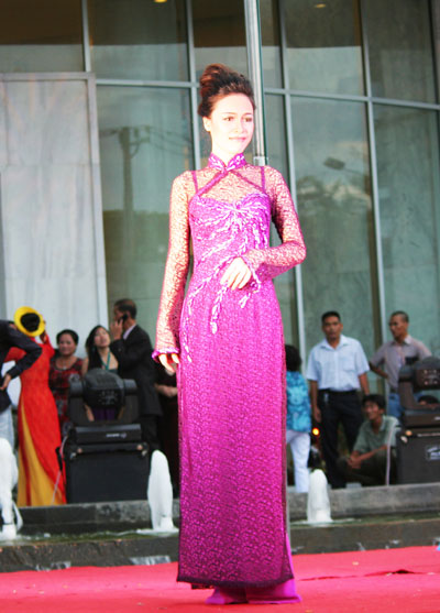 | Dịu dàng hơn với chiếc áo dài màu tím. |