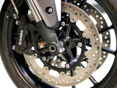 Speed Triple dễ dàng giảm tốc an toàn với hệ thống phanh Brembo và hệ thống chống bó cứng. Cặp đĩa kép phía trước đường kính 320 mm với 4 piston thủy lực hiệu Brembo giảm tốc nhanh chóng. Phối hợp cùng hệ thống chống bó cứng phanh được điều khiển điện tử, cặp giảm sóc Showa trên bánh trước, người cầm lái cảm nhận được chính xác từng thao tác đệm phanh. Phía sau, cụm phanh đĩa đơn đường kính 255 mm cùng cụm giảm sóc Showa dạng đơn (monoshock) cùng tham gia quá trình giảm tốc này, người cầm lái không có cảm giác đuôi xe bị văng sang một bên khi đệm phanh nhanh.
