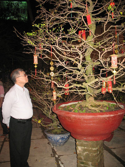 | Cây lão mai bày tại Nhà Thiếu nhi tỉnh đang hấp dẫn nhiều khách hàng, nhưng họ còn băn khoăn nên mua hay thuê. |