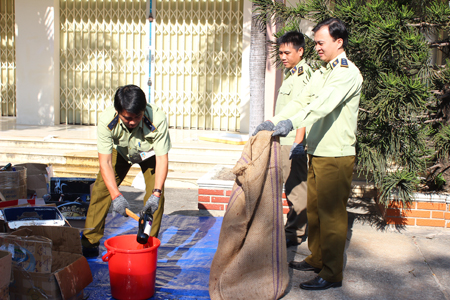 | Lực lượng Quản lý thị trường tiêu hủy rượu nhập lậu |