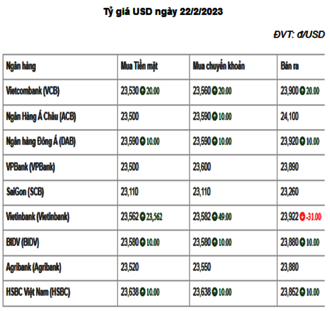 Giá mua USD hiện nằm trong khoảng từ 23.500 – 23.638 VND/USD, còn bán ở mức 23.852 –23.922 VND/USD. Trong đó, Ngân hàng HSBC vừa có giá mua USD cao nhất vừa có giá bán USD thấp nhất so với các ngân hàng khác.