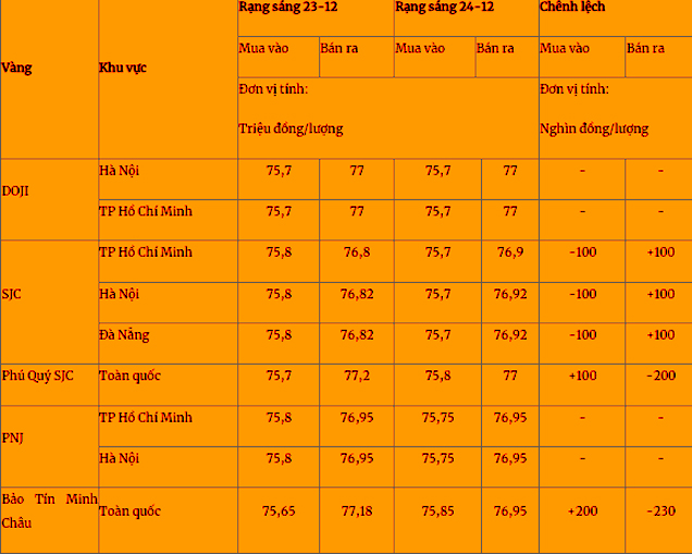 Giá vàng miếng trong nước cập nhật lúc 5 giờ sáng 24-12 như sau: