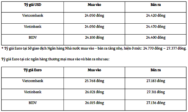 Tỷ giá USD tại các ngân hàng thương mại mua vào và bán ra như sau: