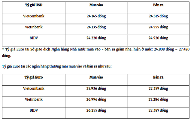 Tỷ giá USD tại các ngân hàng thương mại mua vào và bán ra như sau: