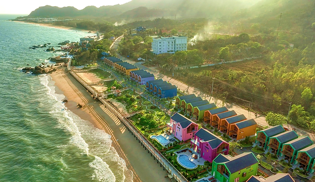 | Trân Châu Beach & Resort với những villa sát biển nhiều màu sắc. |