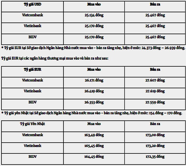 Tỷ giá USD tại các ngân hàng thương mại mua vào và bán ra như sau: