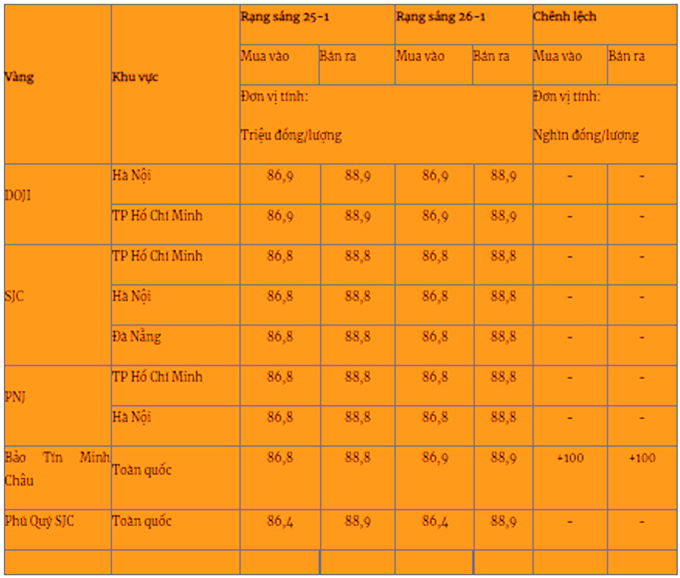 Giá vàng miếng trong nước cập nhật lúc 5 giờ 30 phút sáng 26-1 như sau: