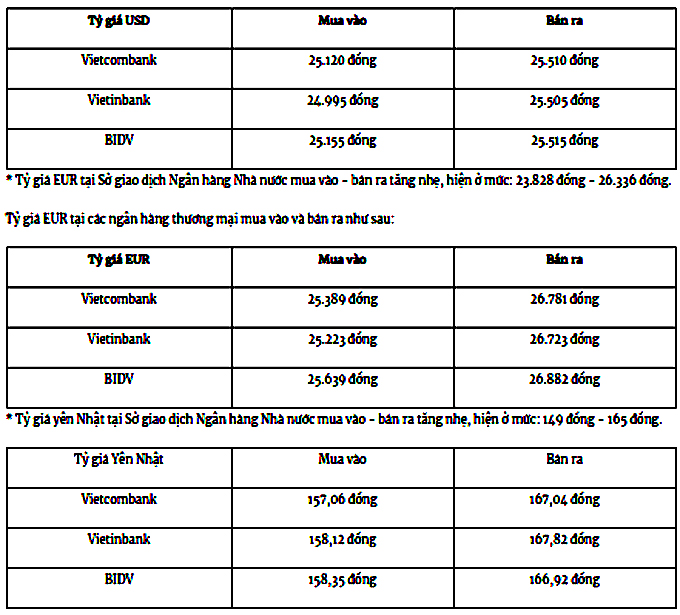 Tỷ giá USD tại các ngân hàng thương mại mua vào và bán ra như sau: