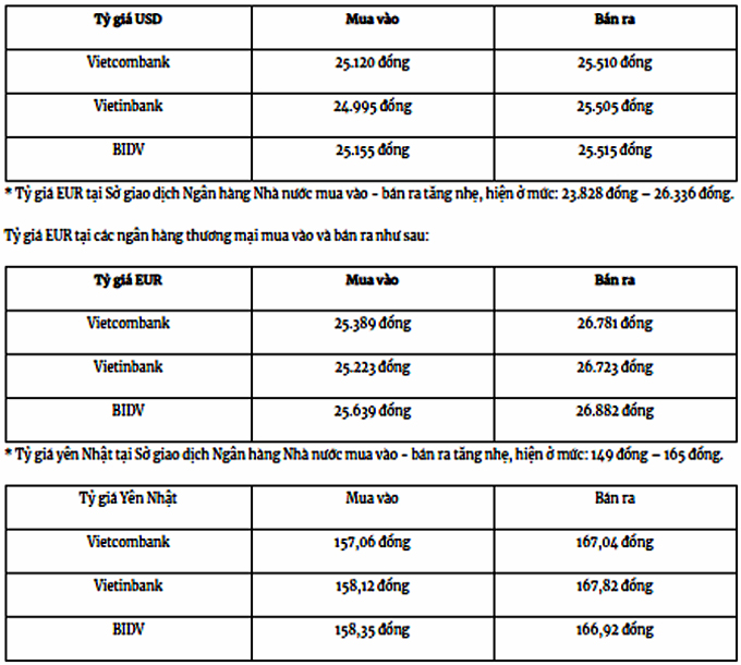 Tỷ giá USD tại các ngân hàng thương mại mua vào và bán ra như sau: