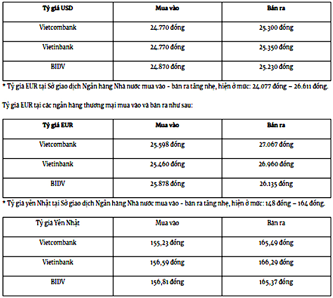 Tỷ giá USD tại các ngân hàng thương mại mua vào và bán ra như sau: