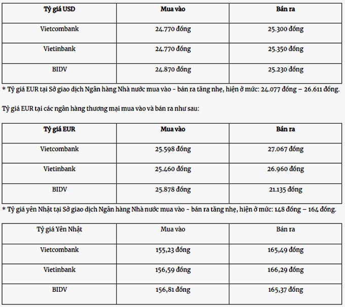 Tỷ giá USD tại các ngân hàng thương mại mua vào và bán ra như sau: