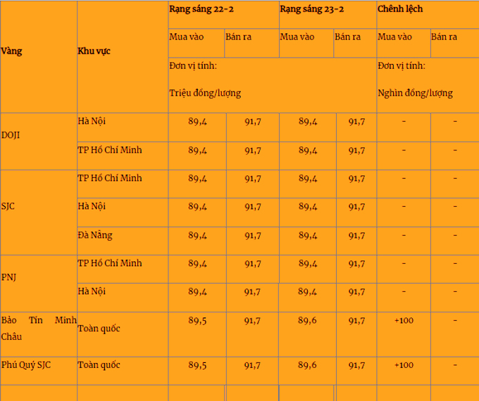 Giá vàng miếng trong nước cập nhật lúc 5 giờ 30 phút sáng 23-2 như sau: