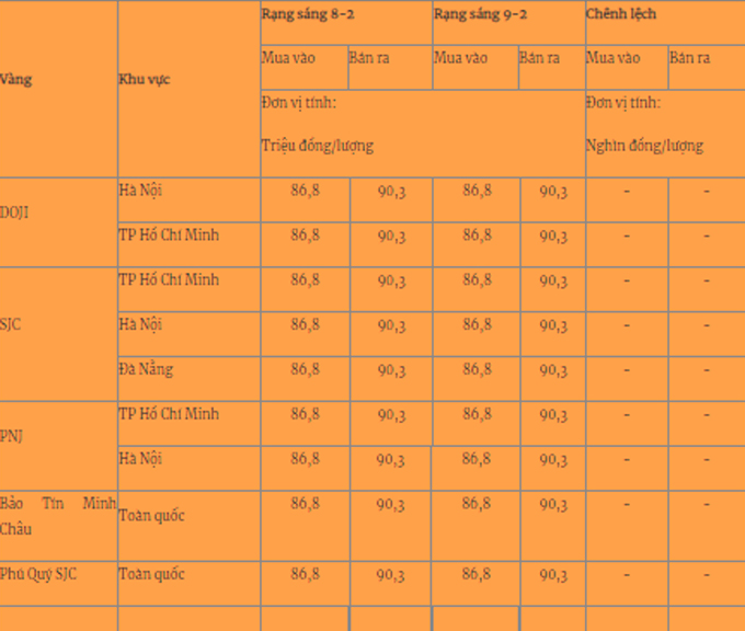 Giá vàng miếng trong nước cập nhật lúc 5 giờ 30 phút sáng 9-2 như sau: