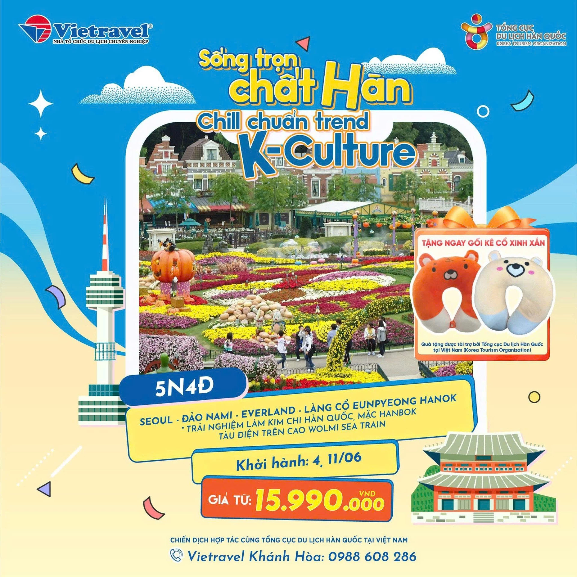 Mùa hè này, hãy cùng Vietravel Khánh Hòa mở cánh cửa bước vào thế giới văn hóa Hàn Quốc (K-Culture) - nơi bạn không chỉ đi để ngắm, mà còn trải nghiệm để cảm từng nét văn hoá xứ kim chi. Với hành trình, Seoul - Đảo Nami - Công viên Everland - Làng cổ Eunpyeong Hanok, du khách sẽ được nhìn ngắm khung cảnh nên thơ bước ra từ các bộ phim truyền hình Hàn Quốc (K-Drama), cảm nhận văn hóa truyền thống đậm đà của xứ sở kim chi trong từng bộ hanbok, từng món ăn đặc trưng...