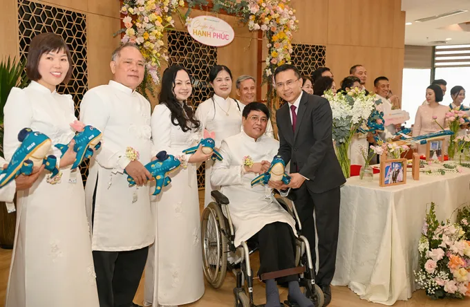 Tại phòng khách Bông Sen, 19 cặp đôi tham gia chuyến bay được Vietnam Airlines trao tặng cặp đôi linh vật (mascot). Những chiếc nơ hoa được người chồng, người vợ nhẹ nhàng buộc vào cổ tay người bạn đời, mang ý nghĩa của sự đồng hành và lời chúc cho những hành trình dài phía trước.