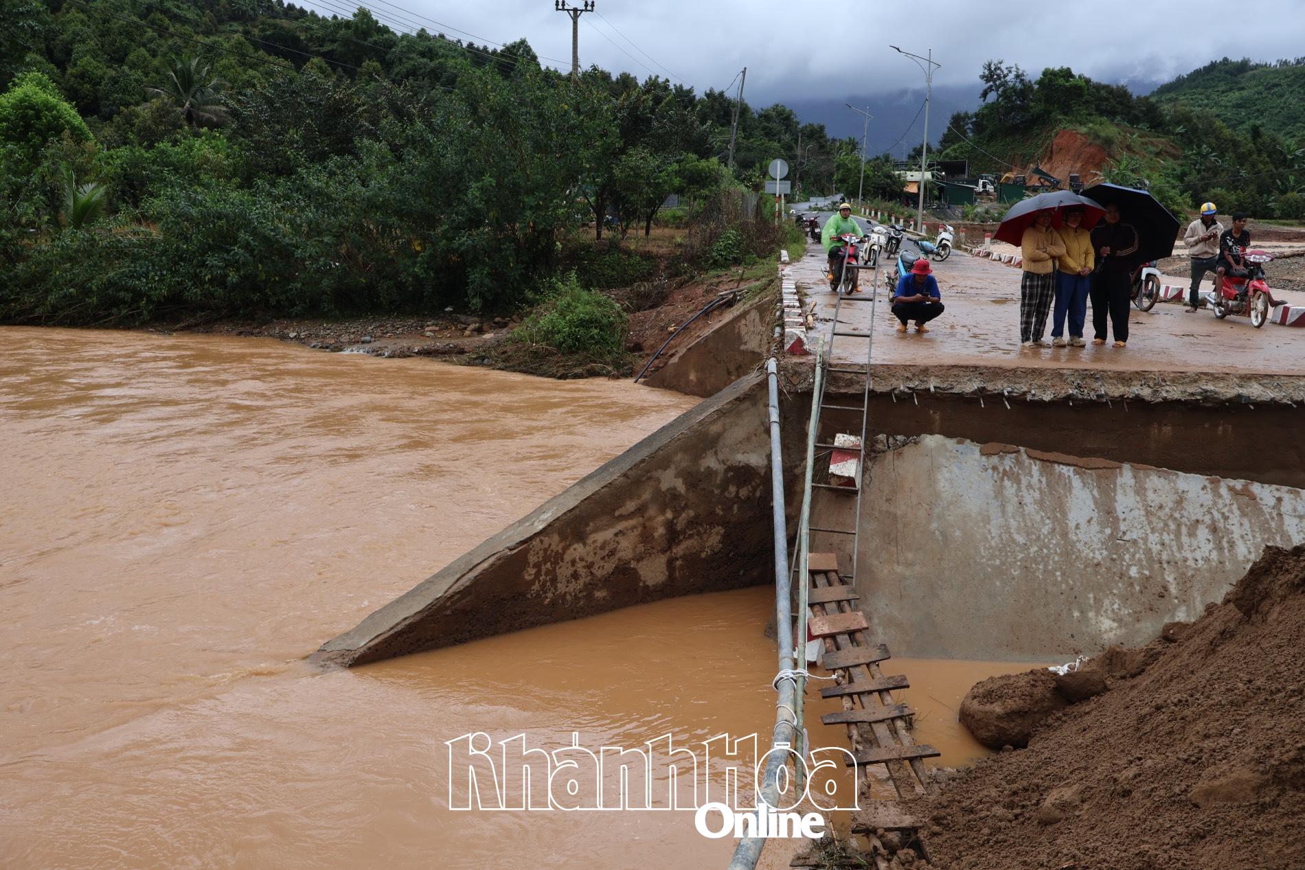 | Cây cầu ở xã Khánh Sơn bị hư hỏng do mưa lũ. |