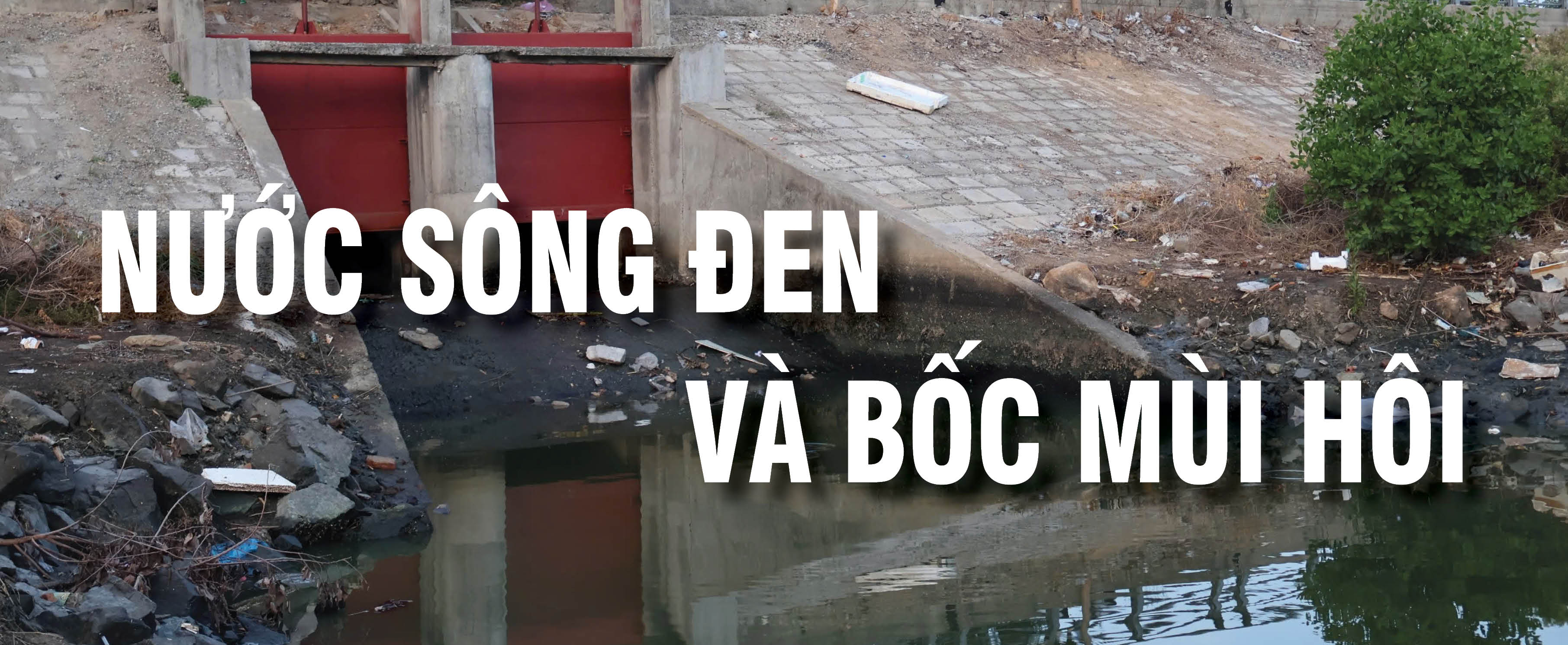 | Khu vực sông Quán Trường dưới chân cầu Dứa (xã Vĩnh Hiệp) chuyển qua màu đen, bốc mùi hôi. |