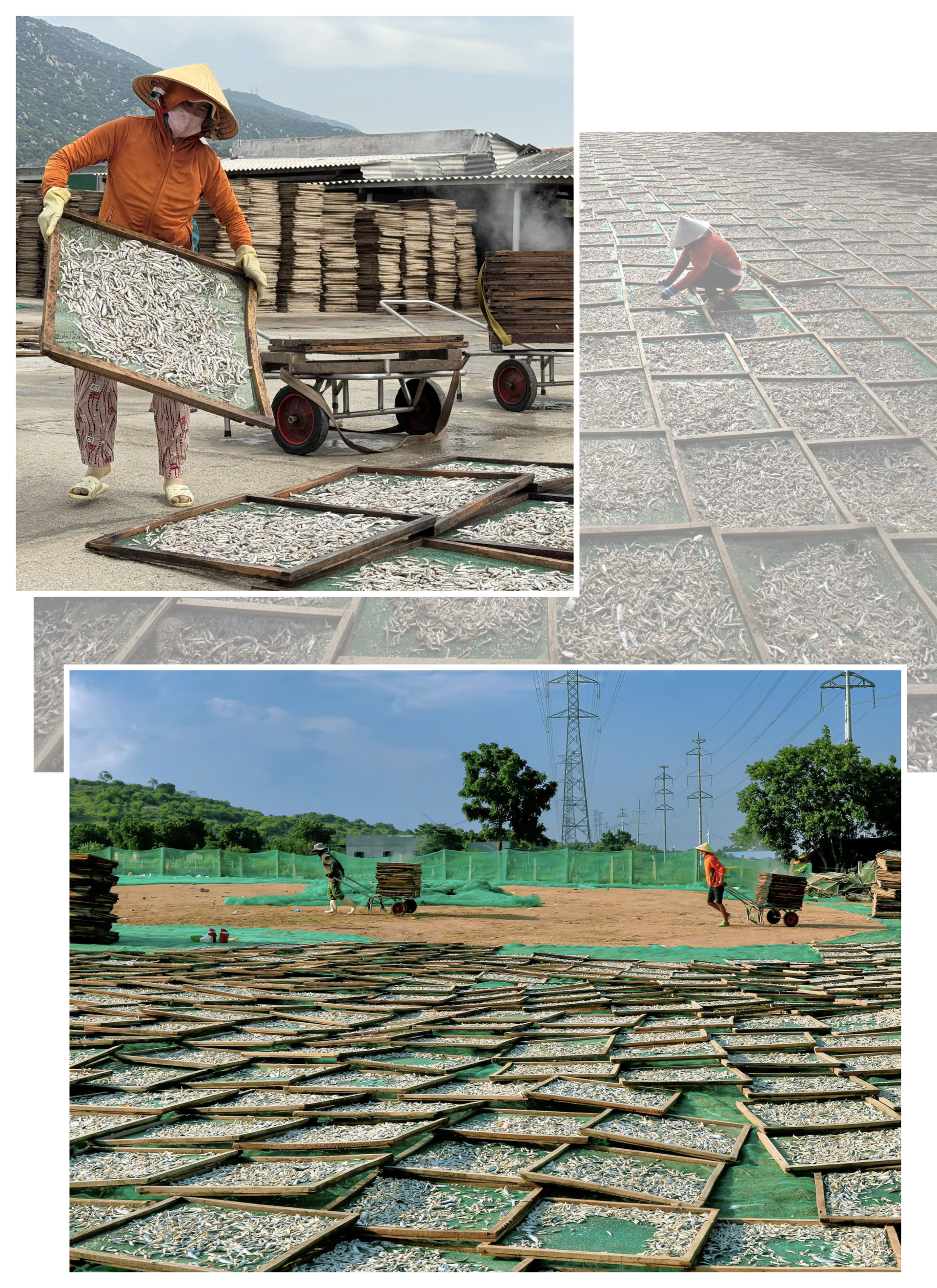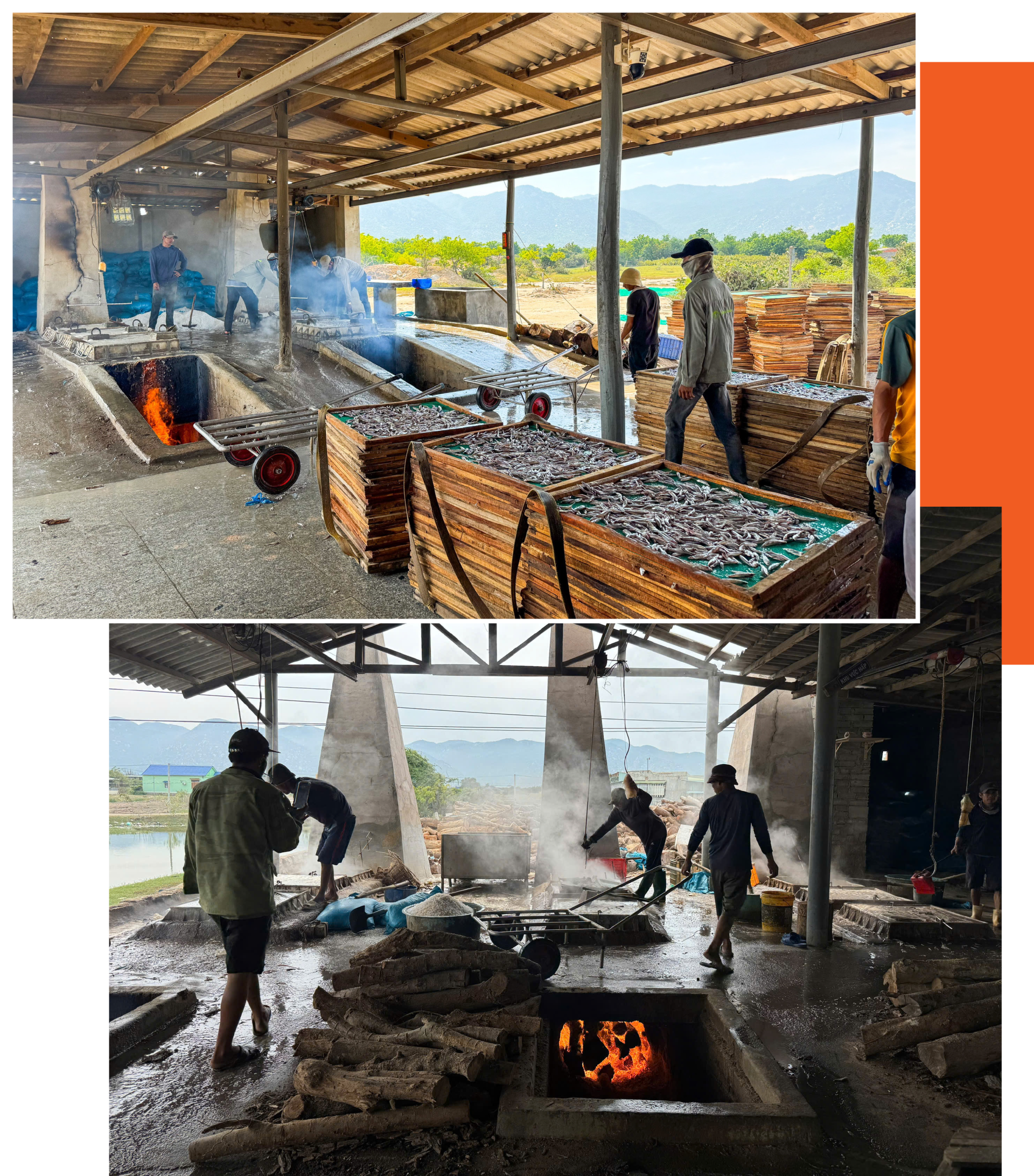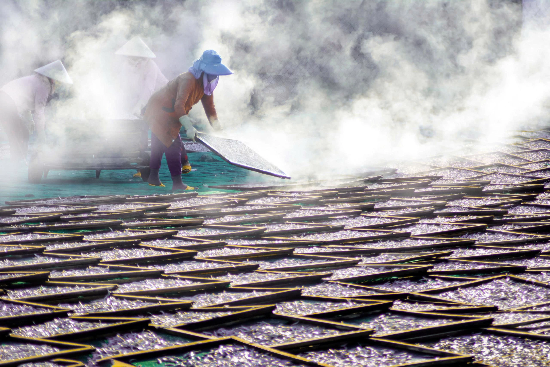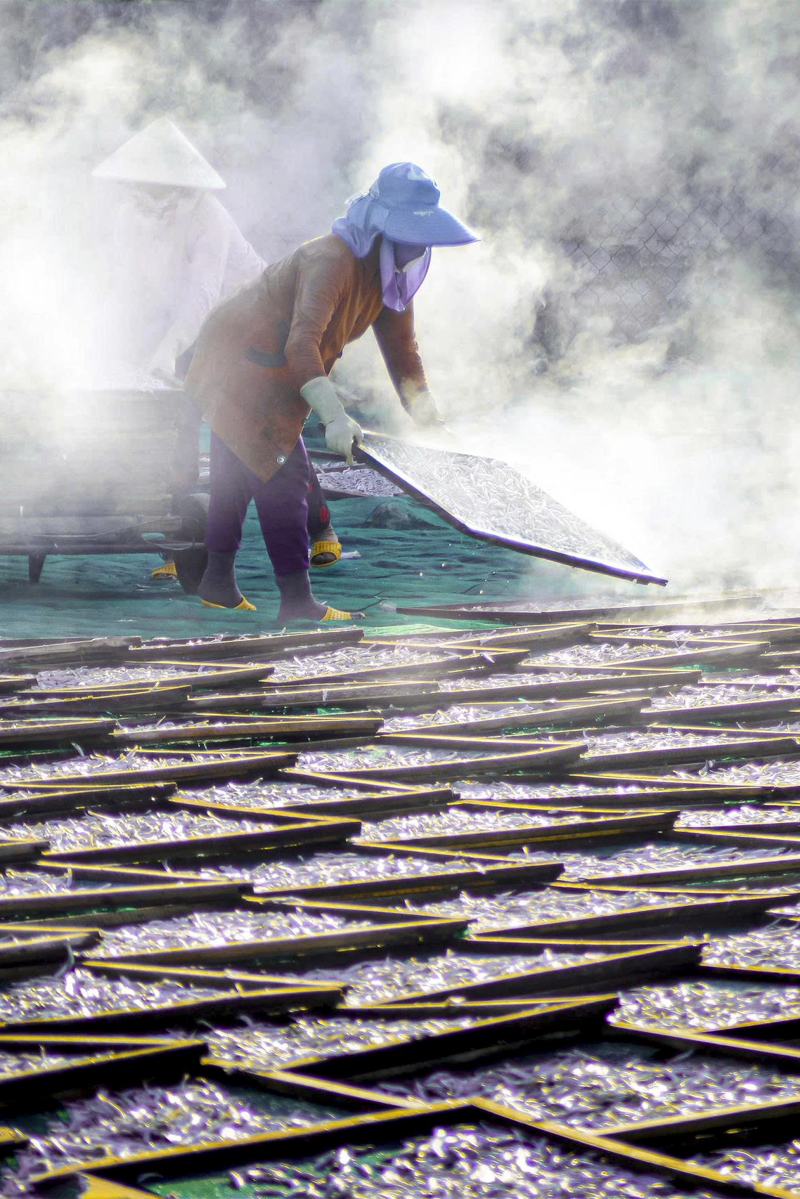 Có mặt tại các cơ sở hấp cá, hơi nước mặn mòi từ những lò hấp bốc lên, quấn lấy mùi thơm đặc trưng của cá cơm vừa chín tới. Tiếng nước sôi sùng sục, tiếng vỉ cá khẽ va vào nhau, tiếng gọi nhau í ới của người lao động khiến không khí thêm khẩn trương và nhộn nhịp.