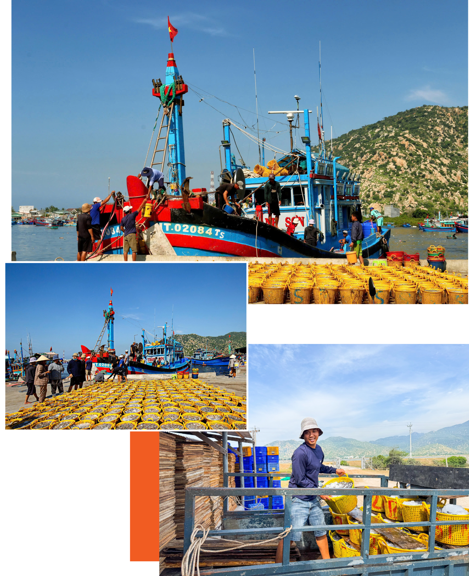 | Ngư dân vận chuyển cá cơm từ thuyền lên Cảng Cà Ná. |
