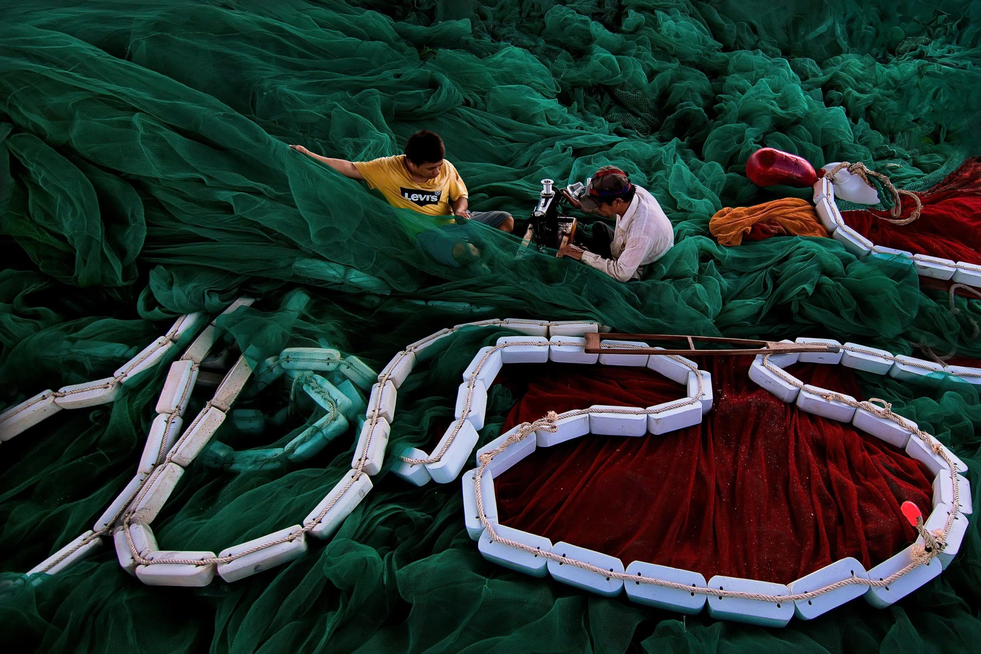 | Ngư dân xã Cà Ná may lưới chuẩn bị ra khơi đánh bắt cá cơm. |