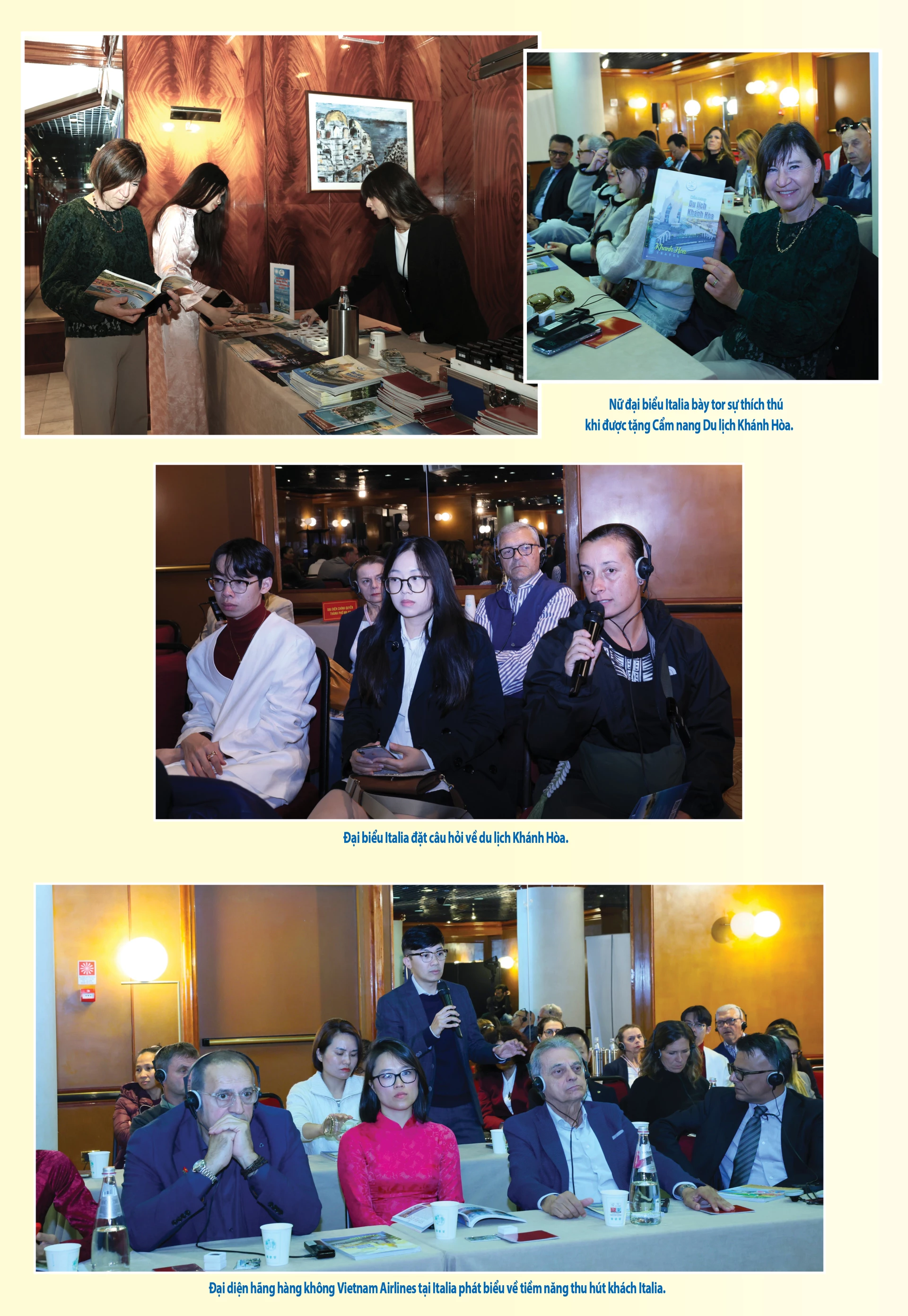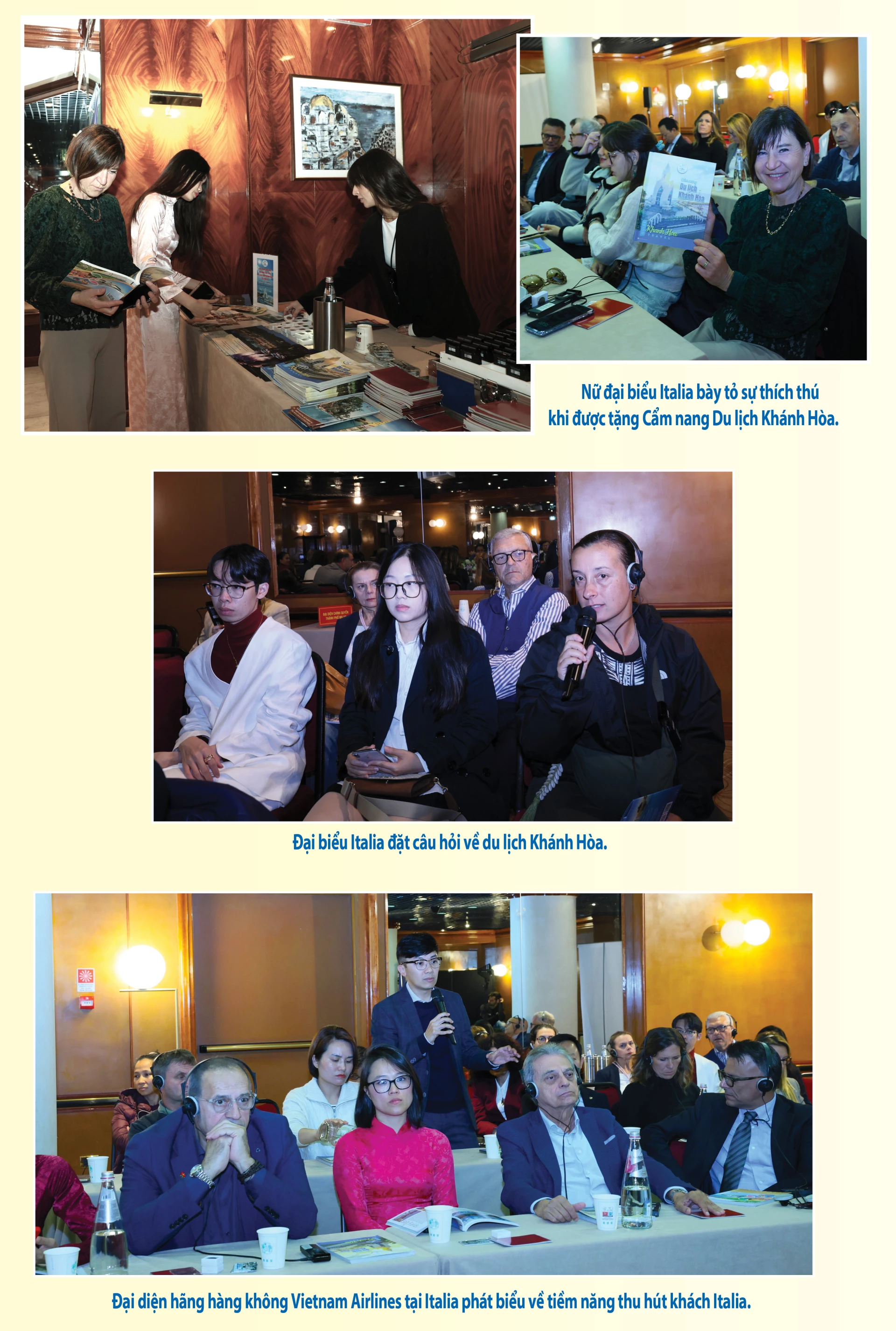 Phát biểu tại hội nghị, đại diện các doanh nghiệp tại Milan quan tâm đến du lịch Khánh Hòa, đường bay, cách gửi hành lý, các dịch vụ vui chơi giải trí và ưu đãi dành cho đoàn famtrip từ Italia đến Khánh Hòa. Một số doanh nghiệp cho biết, người Italia chưa biết nhiều về du lịch Khánh Hòa, muốn thu hút khách phải đẩy mạnh quảng bá, lựa chọn sản phẩm đúng thị hiếu của khách Italia... Lãnh đạo tỉnh Khánh Hòa cùng các sở, ngành của tỉnh đã chia sẻ thông tin, giải đáp các câu hỏi từ các đơn vị lữ hành của Italia.