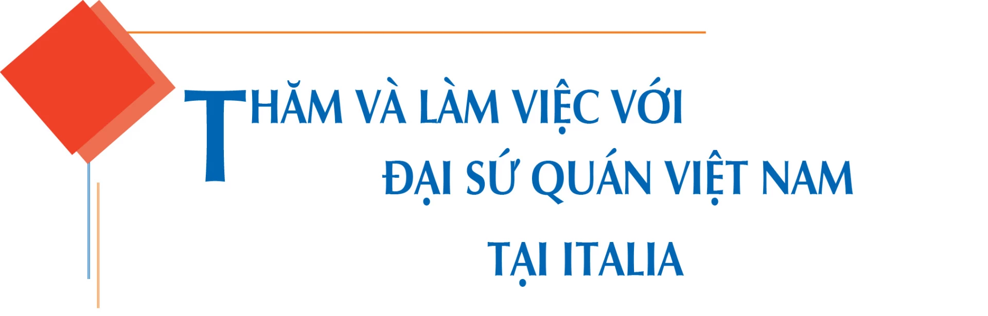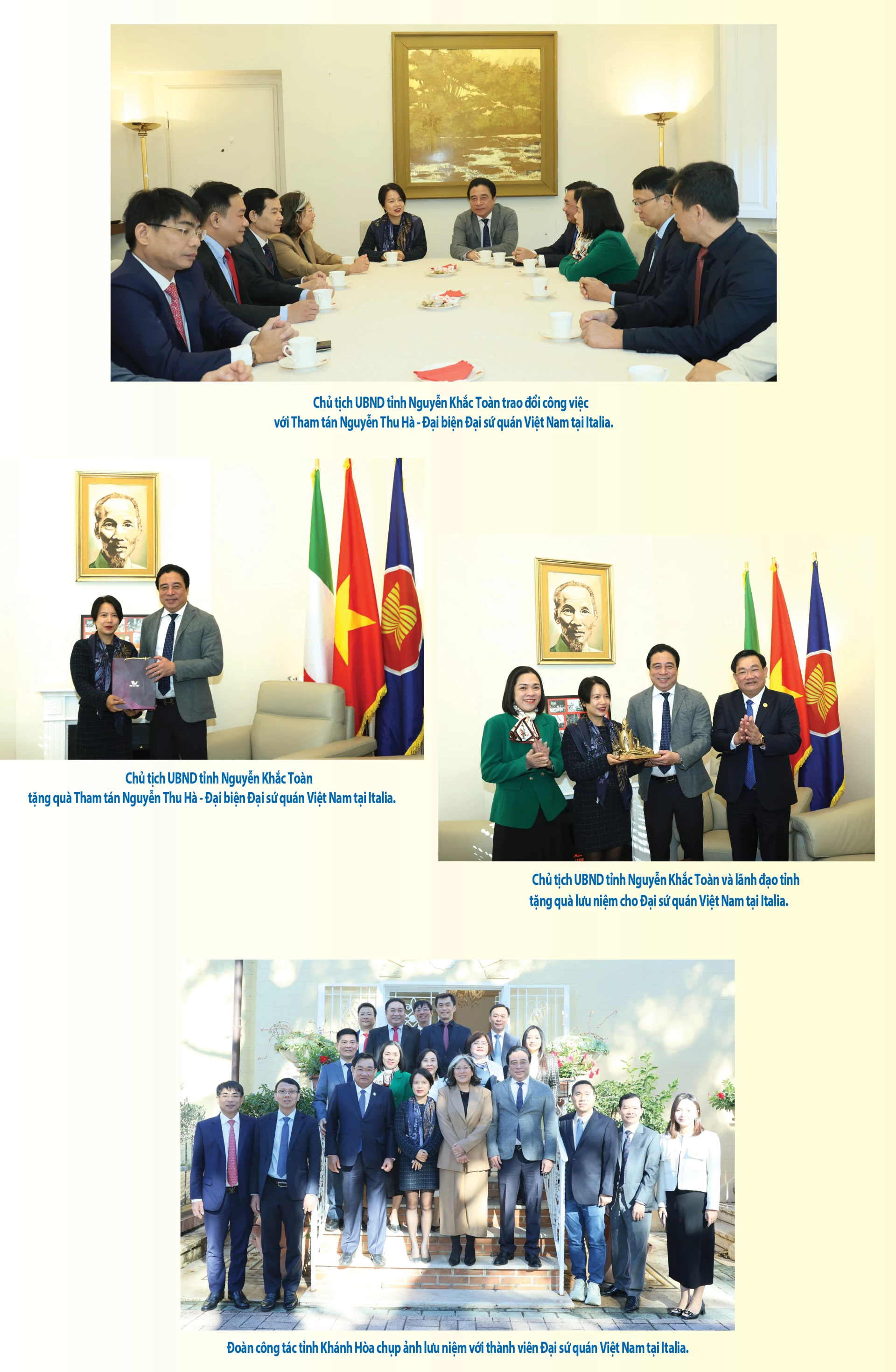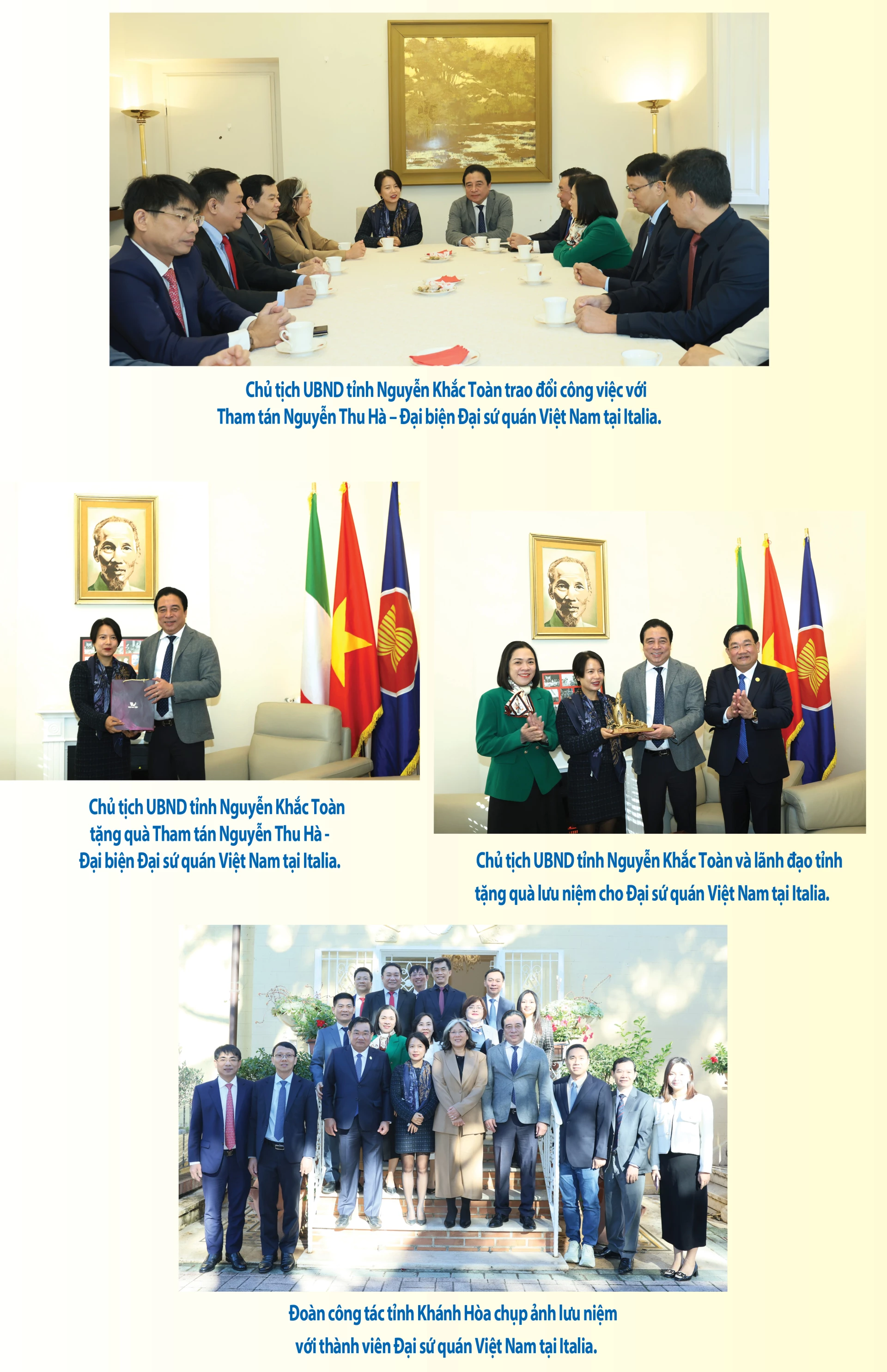 Ngày 7-10, tại Roma, đoàn công tác tỉnh Khánh Hòa đã thăm, làm việc với Đại sứ quán Việt Nam tại Italia. Tiếp đoàn có đồng chí Nguyễn Thu Hà - Tham tán, Đại biện Đại sứ quán Việt Nam tại Italia.