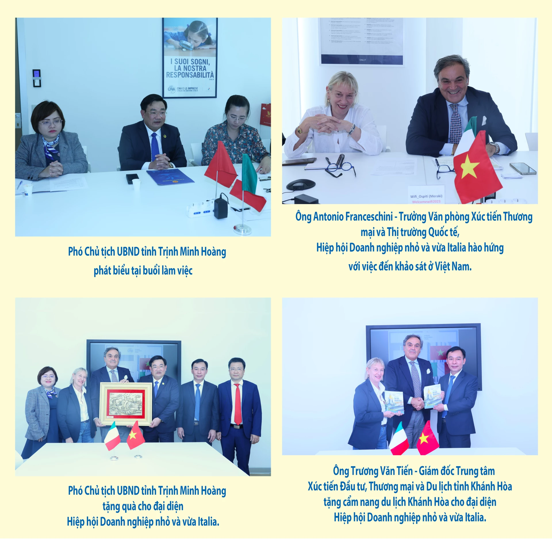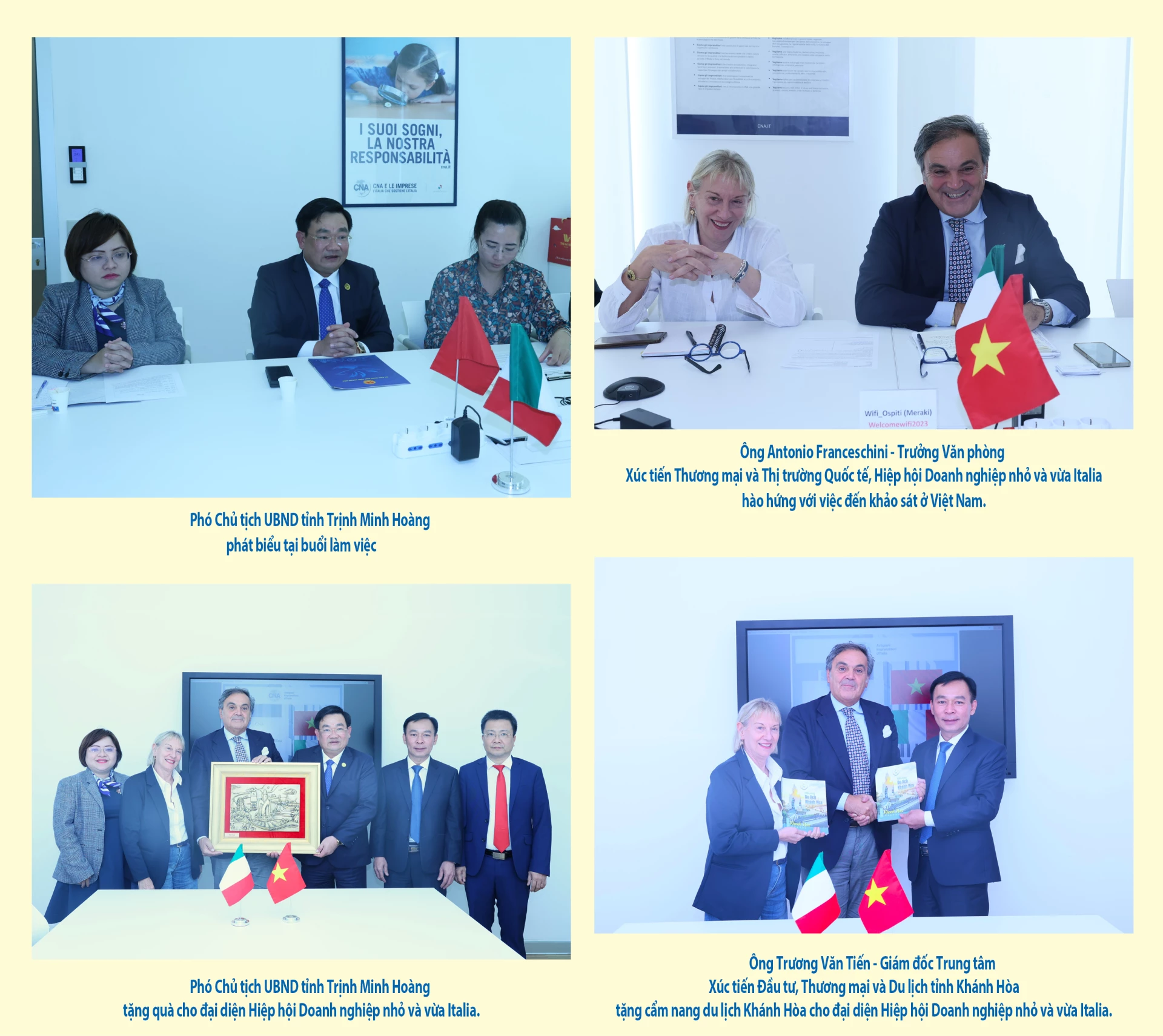 Ông Antonio Franceschini - Trưởng Văn phòng Xúc tiến Thương mại và Thị trường Quốc tế đánh giá rất cao tiềm năng của Khánh Hòa và tỏ ra hào hứng với việc tổ chức đoàn doanh nghiệp đến khảo sát. Hiệp hội có 6.000 doanh nghiệp hoạt động ở 11 nhóm lĩnh vực, từ thực phẩm, du lịch, thời trang đến công nghệ, mở ra nhiều cơ hội hợp tác. Ông Antonio Franceschini cũng đề nghị tỉnh nên tham gia các hội chợ du lịch ở Italia để tiếp cận thị trường, trong đó có hội chợ du lịch Rimini được tổ chức vào đầu tháng 10 hằng năm.