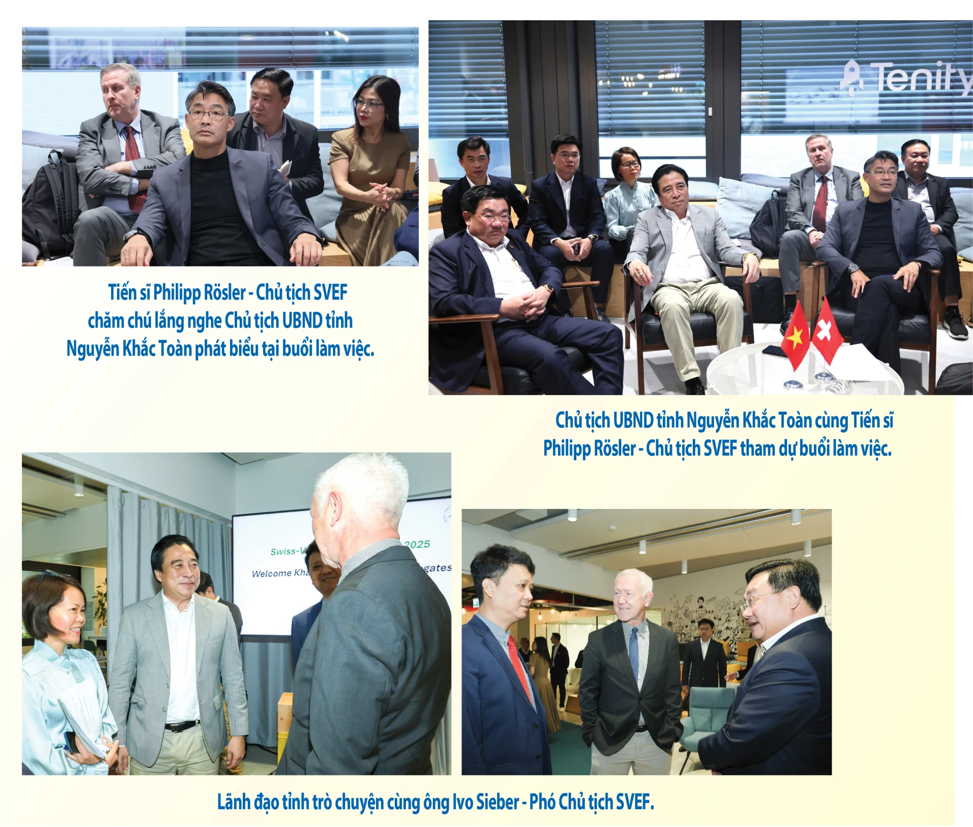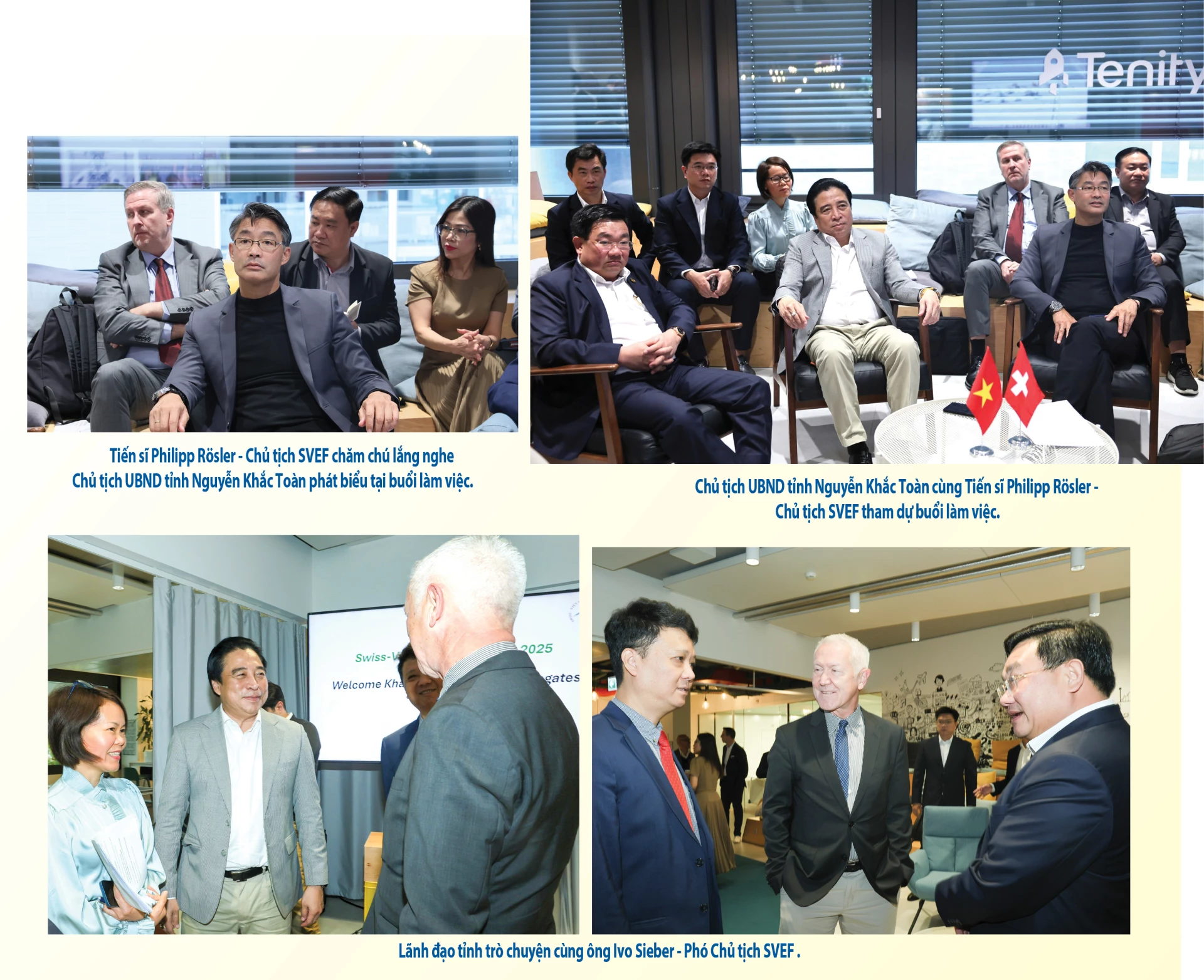 Sáng 10-10, trong khuôn khổ chuyến công tác, đoàn công tác tỉnh Khánh Hòa có buổi làm việc đặc biệt quan trọng với Tổ chức Diễn đàn Kinh tế Thụy Sĩ - Việt Nam (SVEF) tại thành phố Zurich - trung tâm tài chính lớn nhất Thụy Sĩ. Tiếp và làm việc với đoàn có Tiến sĩ Philipp Rösler - Chủ tịch SVEF, cựu Phó Thủ tướng Chính phủ Liên bang Đức, cựu Giám đốc điều hành Diễn đàn Kinh tế Thế giới; ông Ivo Sieber - Phó Chủ tịch SVEF, cựu Đại sứ Thụy Sĩ tại Việt Nam; cùng đại diện lãnh đạo các tập đoàn, doanh nghiệp Thụy Sĩ trong lĩnh vực công nghệ, y tế số và đầu tư.