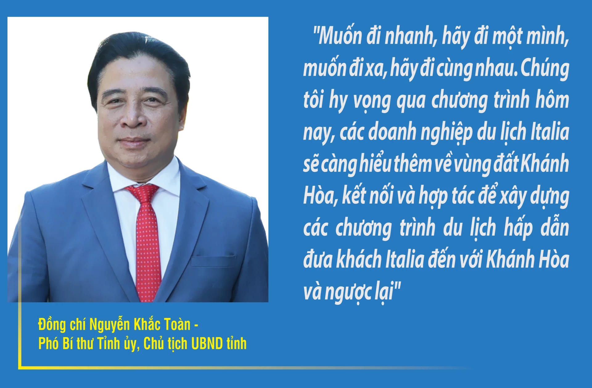 Phát biểu khai mạc hội nghị, Chủ tịch UBND tỉnh Nguyễn Khắc Toàn chia sẻ: “Khánh Hòa được mệnh danh là nơi “rừng trầm, biển yến”. Năm 2024, tỉnh đã đón 4,8 triệu lượt khách quốc tế, 9 tháng năm 2025 đón 4,1 triệu lượt. Sân bay quốc tế Cam Ranh đã vươn lên top 4 sân bay đông khách và hiện đại nhất Việt Nam”. Trong tiến trình phát triển mới, Khánh Hòa xác định công nghiệp, năng lượng và du lịch là 3 trụ cột bứt phá. Tỉnh phấn đấu đưa du lịch trở thành ngành kinh tế mũi nhọn, chiếm trên 15% GRDP và 20% thu ngân sách vào năm 2030. “Muốn đi nhanh, hãy đi một mình, muốn đi xa, hãy đi cùng nhau. Chúng tôi hy vọng các doanh nghiệp du lịch Italia sẽ càng hiểu thêm về Khánh Hòa, kết nối và hợp tác để xây dựng các chương trình du lịch hấp dẫn”, Chủ tịch UBND tỉnh Nguyễn Khắc Toàn nhấn mạnh.