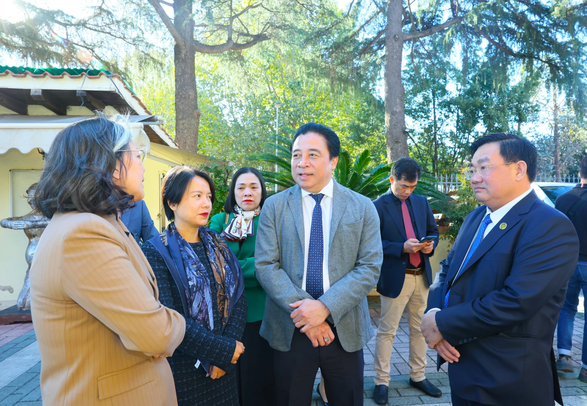 | Chủ tịch UBND tỉnh Nguyễn Khắc Toàn trò chuyện với cán bộ Đại sứ quán Việt Nam tại Italia. |