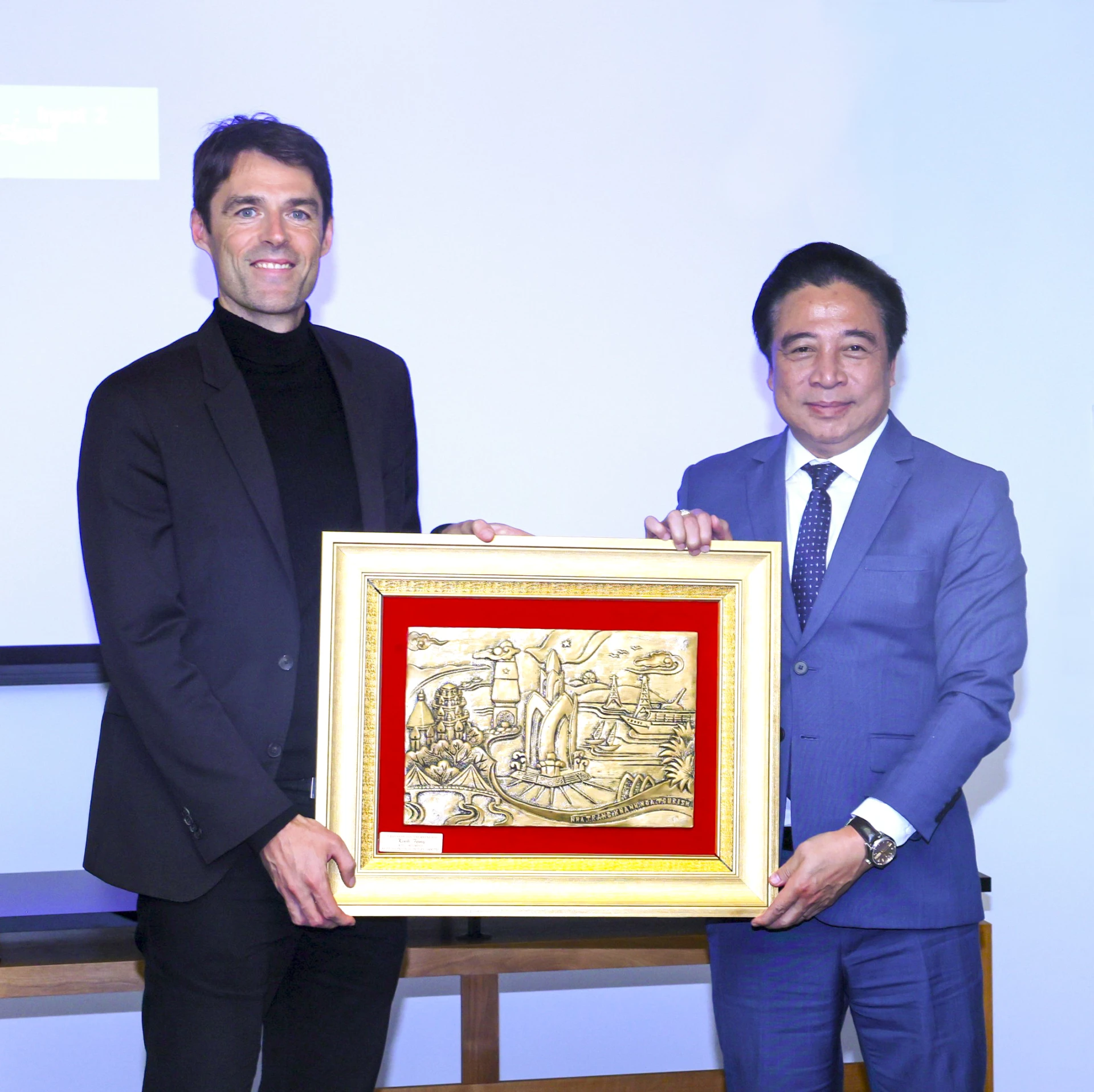 | Chủ tịch UBND tỉnh Nguyễn Khắc Toàn tặng quà lưu niệm cho Trường Đại học Lausanne. |