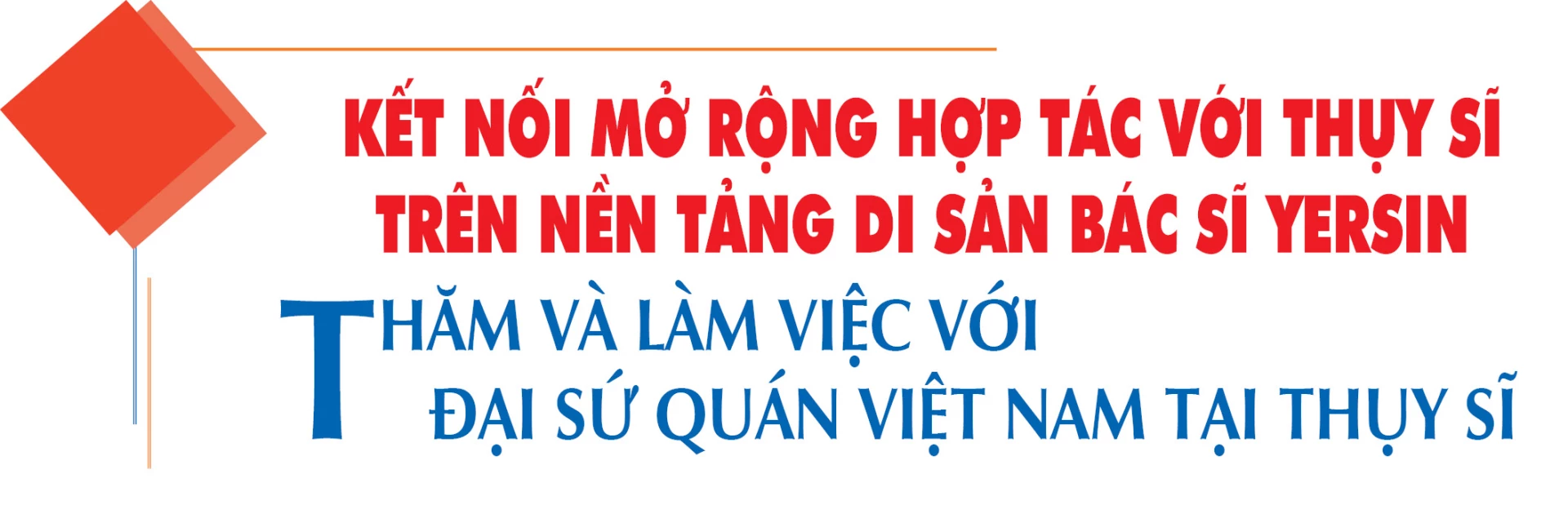 Sáng 9-10, trong khuôn khổ chuyến công tác, đoàn đến thăm và làm việc với Đại sứ quán Việt Nam tại Thụy Sĩ. Tiếp đoàn có các đồng chí: Chu Thu Hằng - Tham tán, Đại biện Đại sứ quán Việt Nam tại Thụy Sĩ; Nguyễn Đức Thương - Tham tán Thương mại, cùng các cán bộ Đại sứ quán. Đây là bước khởi đầu quan trọng cho chuỗi hoạt động tại Thụy Sĩ, đất nước có mối liên hệ đặc biệt với Khánh Hòa thông qua di sản bác sĩ Alexandre Yersin.
