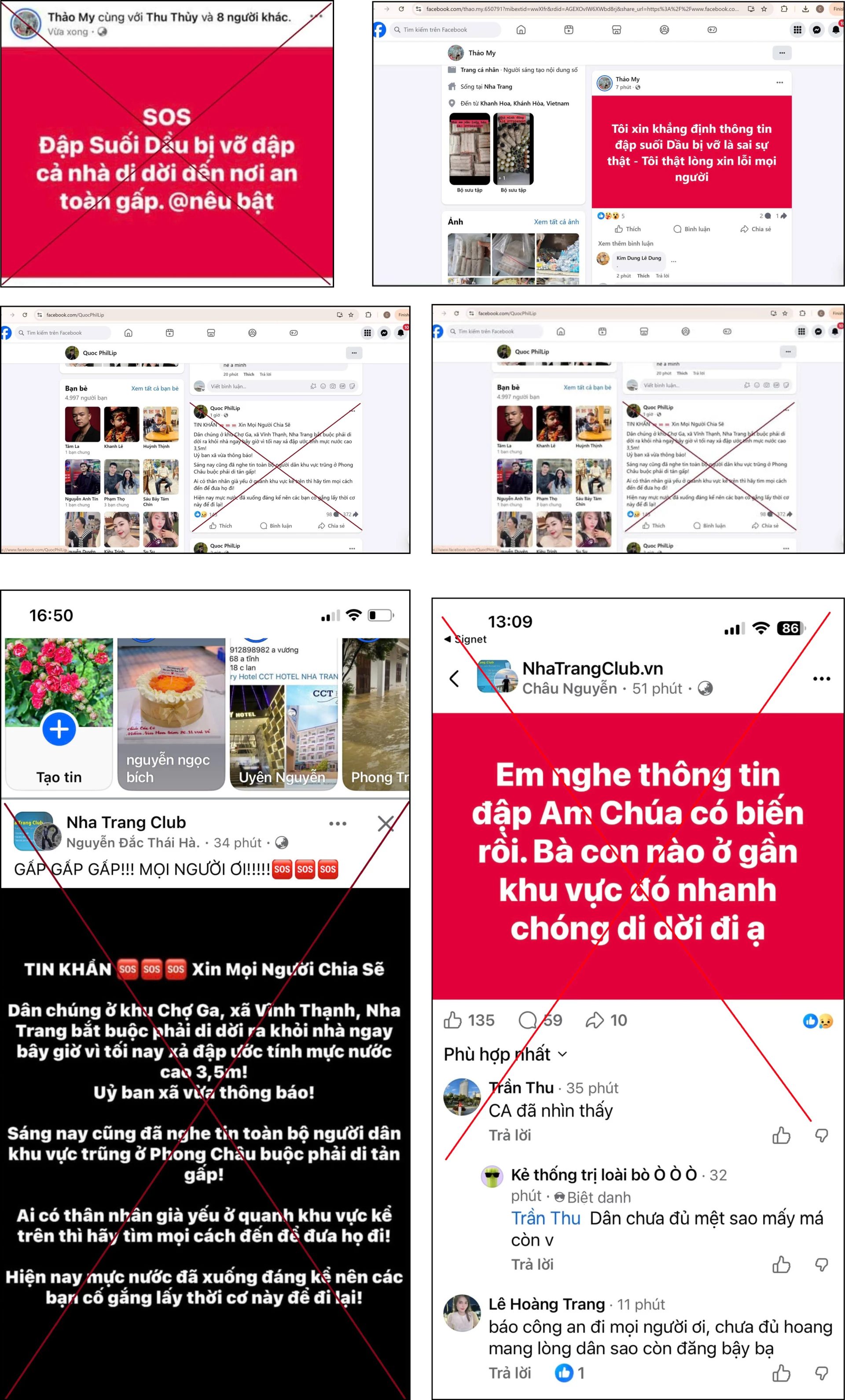 Một dạng tin giả phổ biến khác là các thông tin bịa đặt về xả lũ hoặc vỡ đập thủy lợi. Tại Khánh Hòa, hàng loạt bài đăng trên Facebook và TikTok khẳng định “vỡ đập Am Chúa” hay “xả lũ khẩn cấp gây ngập úng” khiến người dân hoảng loạn. Thực tế, chính quyền địa phương đã nhanh chóng bác bỏ những tin đồn này, khẳng định các hồ, đập vẫn an toàn và hoạt động bình thường. Công an đã mời làm việc và xử lý nhiều đối tượng đăng tải thông tin sai sự thật, nhằm ổn định dư luận và tránh tình trạng hỗn loạn không đáng có. Những hành vi này không chỉ gây nhiễu loạn thông tin mà còn làm chậm công tác ứng phó thiên tai, có thể dẫn đến hậu quả nghiêm trọng hơn.