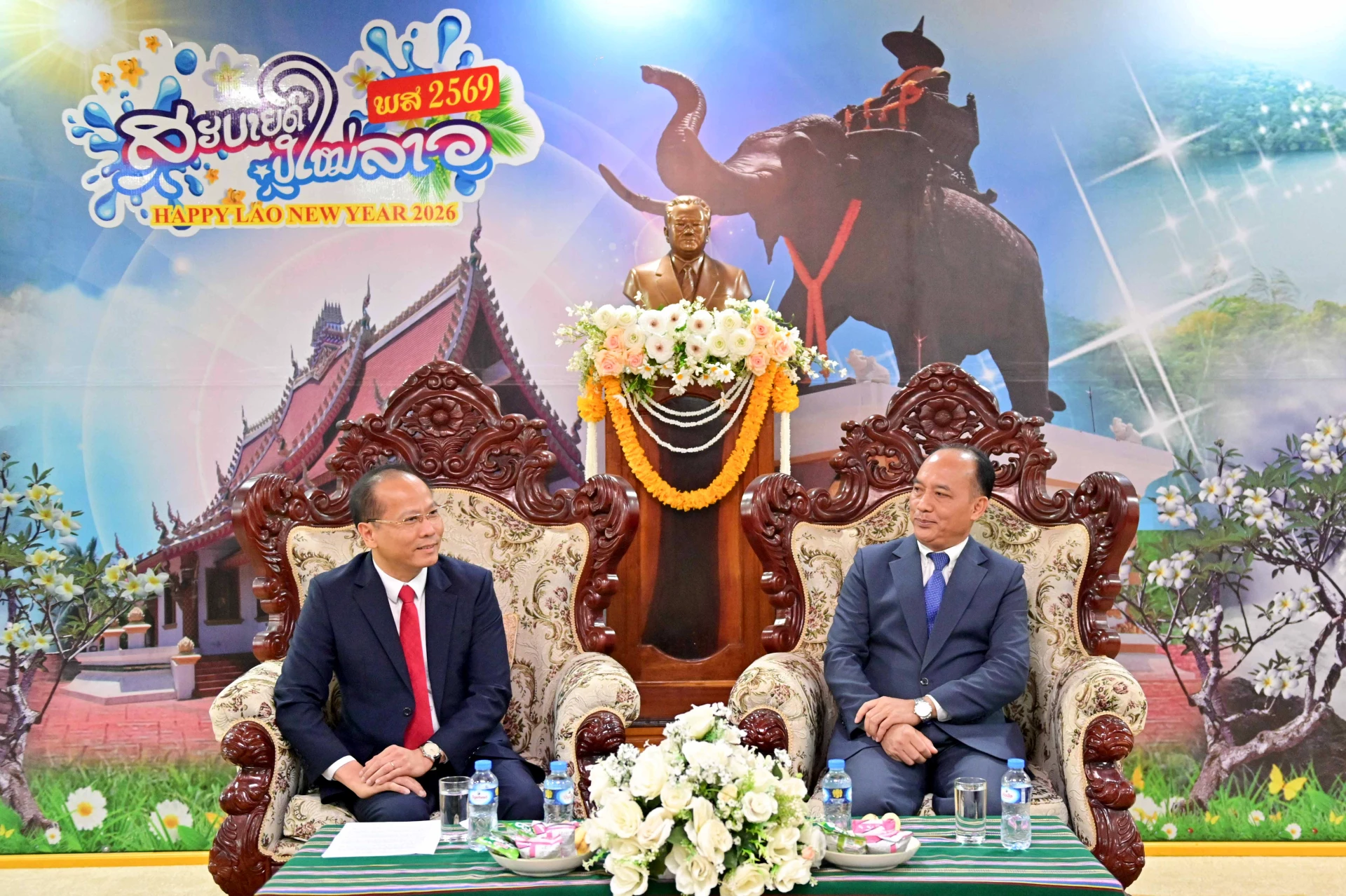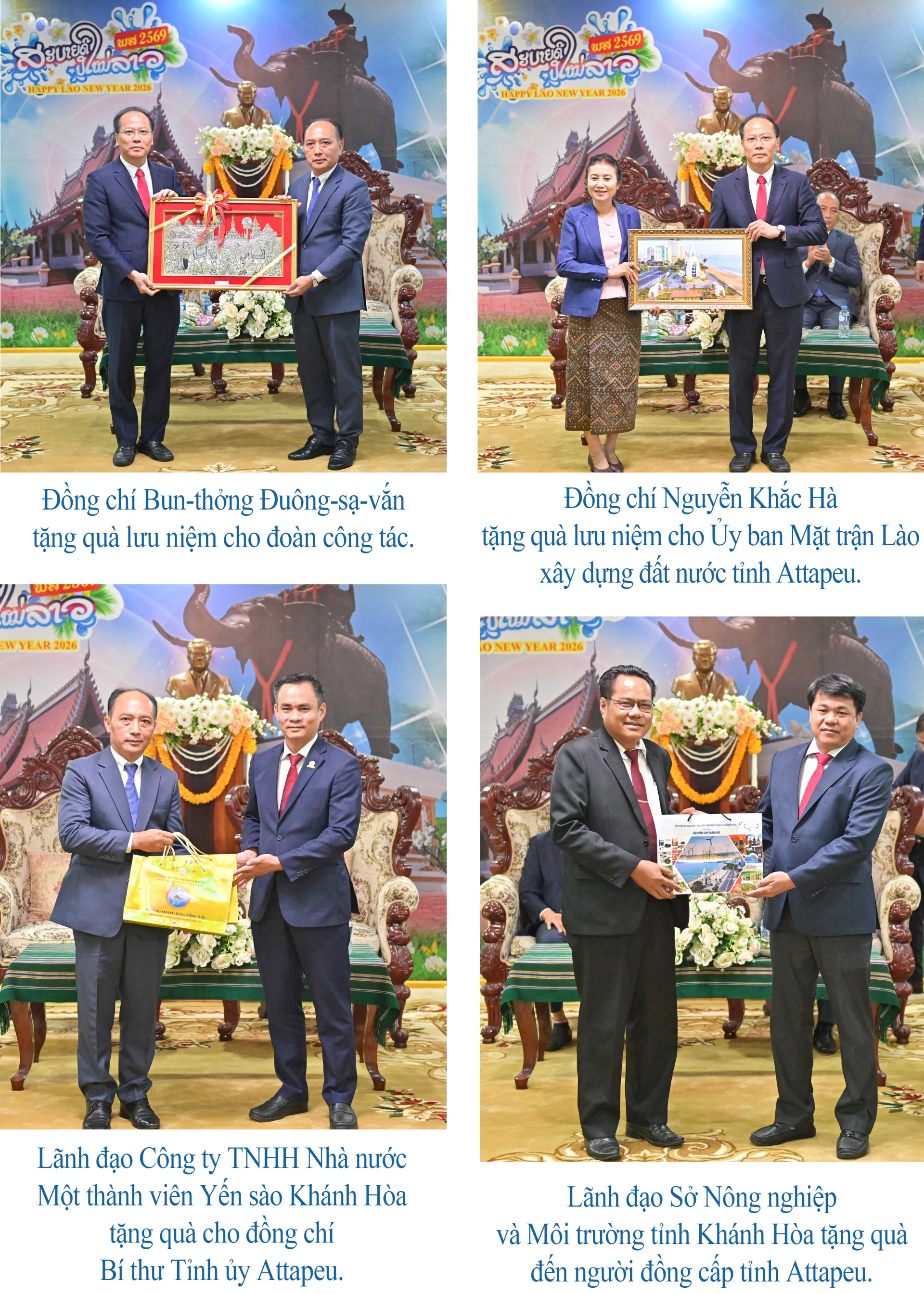 Tại đây, đồng chí Nguyễn Khắc Hà thay mặt lãnh đạo và Nhân dân tỉnh Khánh Hòa gửi lời thăm hỏi chân thành, lời chúc mừng nồng nhiệt của đồng chí Bí thư Tỉnh ủy Khánh Hòa đến đồng chí Bun-thởng Đuông-sạ-vắn cùng lãnh đạo, cán bộ, nhân dân tỉnh Attapeu đón Tết Bunpimay vui vẻ, hạnh phúc và thành công. Đồng chí gửi lời cảm ơn Đảng bộ, chính quyền và nhân dân tỉnh Attapeu vừa qua đã kịp thời hỗ trợ tỉnh Khánh Hòa 150 triệu Kip Lào để khắc phục hậu quả mưa lũ cuối năm 2025.