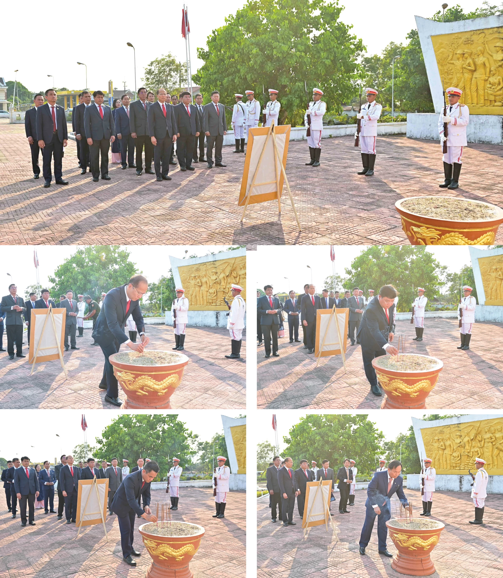 Trong không khí trang nghiêm, các thành viên trong đoàn công tác đặt vòng hoa, dâng hương tưởng niệm, bày tỏ lòng thành kính, biết ơn sâu sắc các anh hùng liệt sĩ của Việt Nam và Lào đã kề vai chiến đấu, anh dũng hy sinh trong sự nghiệp giải phóng dân tộc, góp phần giành độc lập, tự do cho mỗi quốc gia.