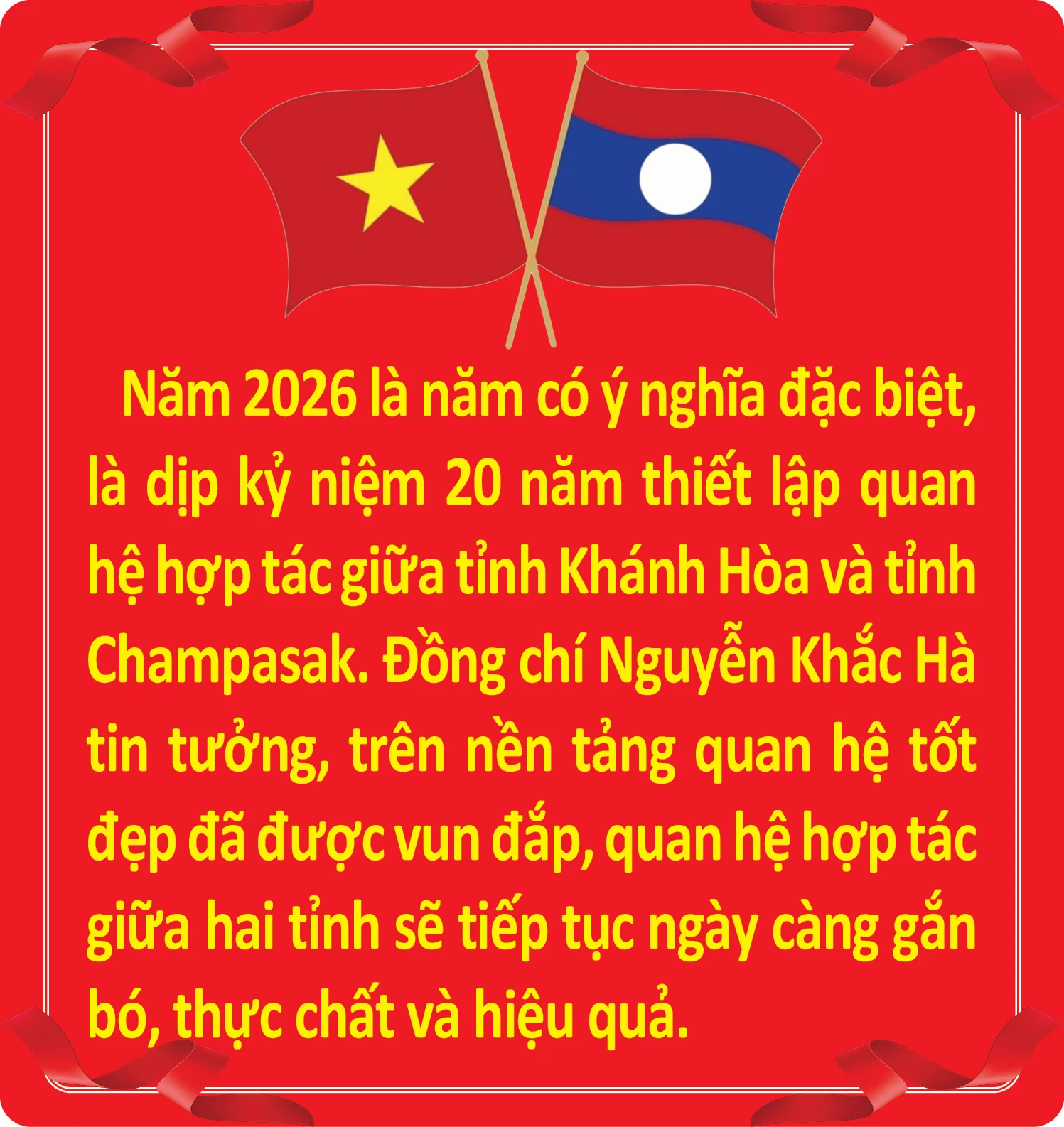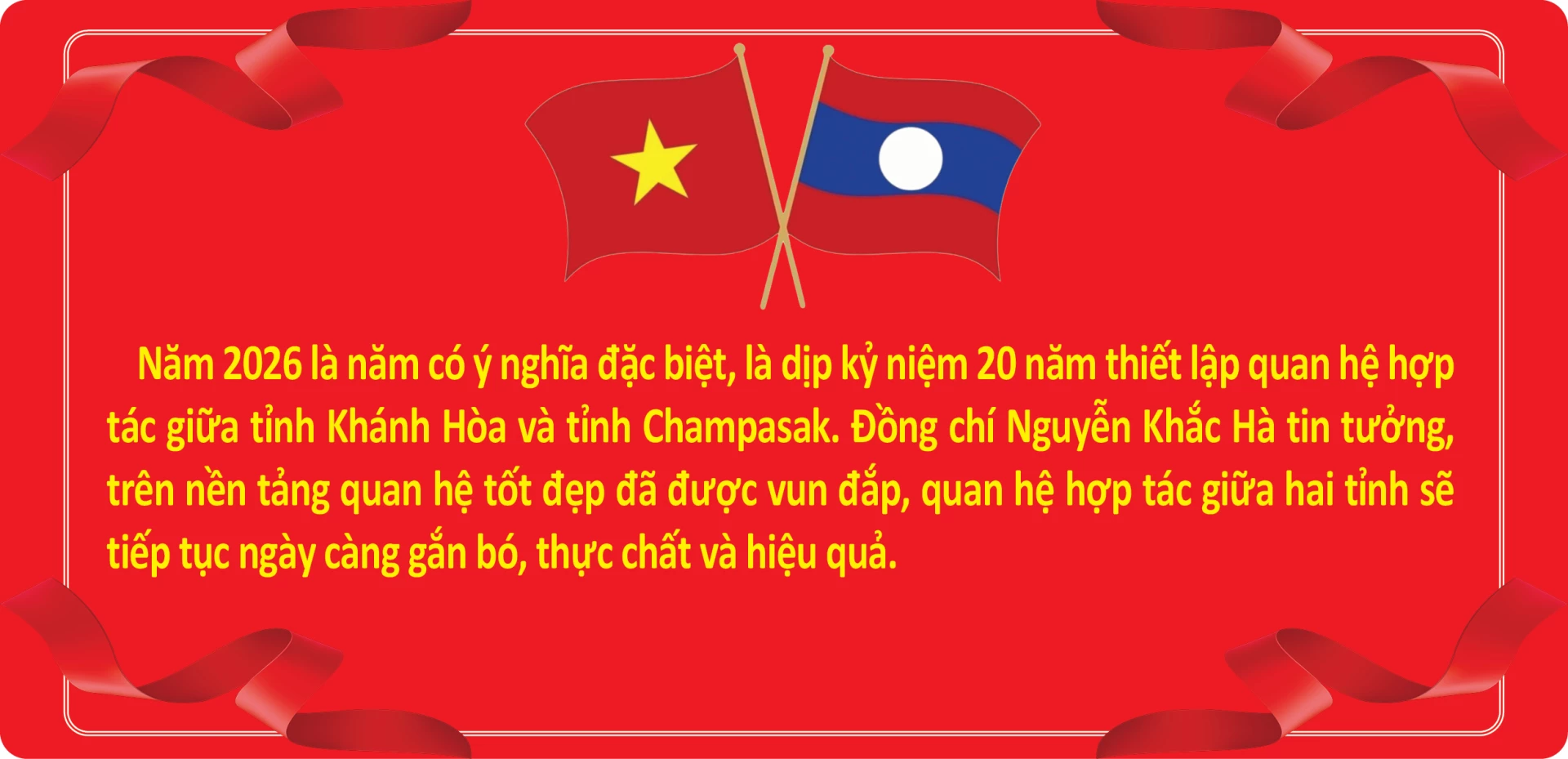 Năm 2026 là năm có ý nghĩa đặc biệt, là dịp kỷ niệm 20 năm thiết lập quan hệ hợp tác giữa tỉnh Khánh Hòa và tỉnh Champasak. Đồng chí Nguyễn Khắc Hà tin tưởng, trên nền tảng quan hệ tốt đẹp đã được vun đắp, quan hệ hợp tác giữa hai tỉnh sẽ tiếp tục ngày càng gắn bó, thực chất và hiệu quả. Để tăng cường và mở rộng mối quan hệ hợp tác, Phó Bí thư Tỉnh ủy Nguyễn Khắc Hà đề xuất hai tỉnh quan tâm tăng cường giao lưu, trao đổi chuyên môn, chia sẻ kinh nghiệm giữa các cấp, các ngành và giao lưu Nhân dân; tổ chức các hoạt động giao lưu văn hóa, nghệ thuật; cùng nghiên cứu mở rộng các hoạt động hợp tác kinh tế theo hướng thiết thực, hiệu quả. Tích cực hỗ trợ, tạo điều kiện thuận lợi cho các doanh nghiệp triển khai các hoạt động kinh doanh cũng như thực hiện các dự án đầu tư trong thời gian tới; xem xét mở rộng hợp tác sang các lĩnh vực khác như: Nông nghiệp, trồng trọt, chăn nuôi... và những ngành nghề phù hợp với thế mạnh của mỗi địa phương. Đồng chí cũng mong muốn tỉnh Champasak sẽ tiếp tục quan tâm, tạo điều kiện thuận lợi để người dân và doanh nghiệp Khánh Hòa sinh sống, làm ăn ổn định, đóng góp hiệu quả vào sự phát triển chung của hai địa phương. Hai tỉnh tiếp tục trao đổi và tiến tới ký kết Bản ghi nhớ hợp tác giai đoạn mới, làm cơ sở định hướng cho các hoạt động hợp tác toàn diện, lâu dài và phù hợp với thực tiễn của mỗi bên.