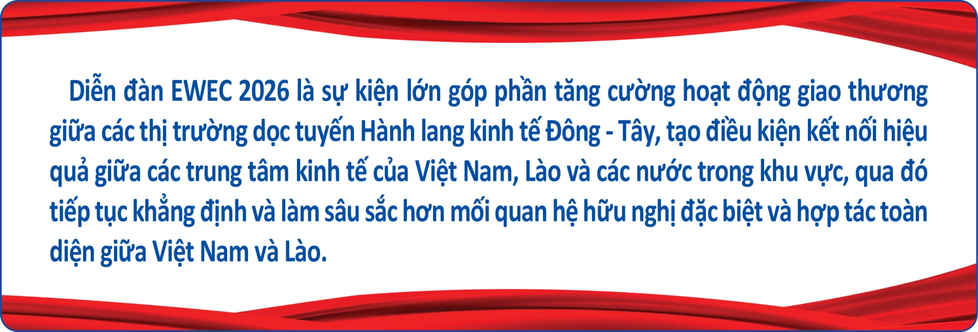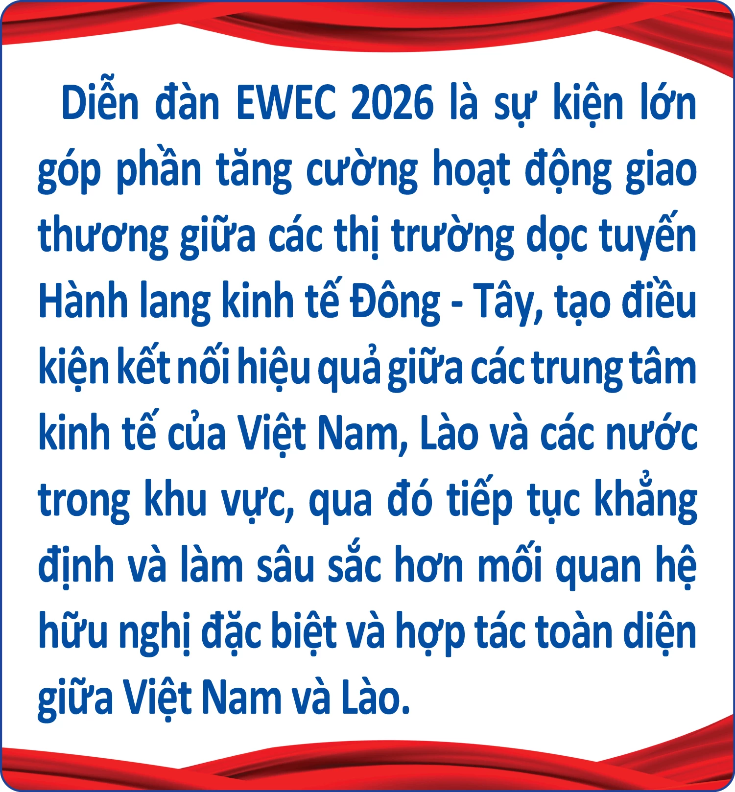 Diễn đàn EWEC 2026 là sự kiện lớn góp phần tăng cường hoạt động giao thương giữa các thị trường dọc tuyến Hành lang kinh tế Đông - Tây, tạo điều kiện kết nối hiệu quả giữa các trung tâm kinh tế của Việt Nam, Lào và các nước trong khu vực, qua đó tiếp tục khẳng định và làm sâu sắc hơn mối quan hệ hữu nghị đặc biệt và hợp tác toàn diện giữa Việt Nam và Lào. Đây cũng là cơ hội để các các địa phương khu vực Nam - Trung Lào quảng bá, thu hút nguồn lực phát triển, thúc đầy tăng trưởng kinh tế - xã hội và mở rộng hợp tác khu vực.