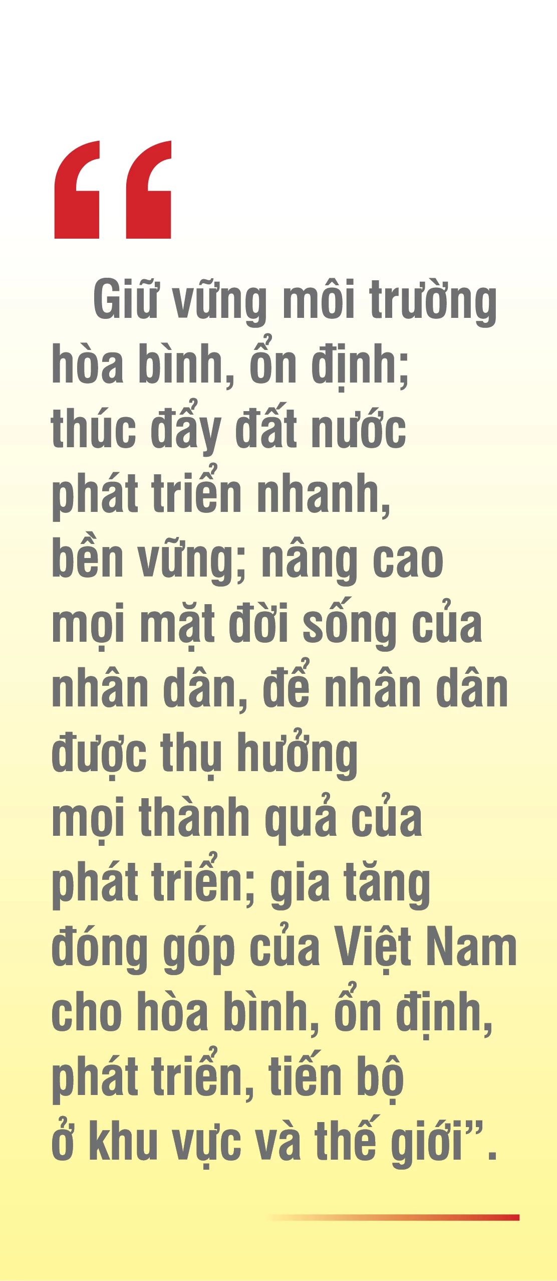 Với truyền thống nghìn năm dựng nước, giữ nước và những giá trị di sản vĩ đại từ cha ông, với khát vọng vươn lên không ngừng, ý chí sắt đá và bản lĩnh kiên cường, với chân lý “Nước Việt Nam là một, dân tộc Việt Nam là một”, với quyết tâm không thể để đất nước tụt hậu, không thể để nhân dân mất cơ hội phát triển, phải hành động vì tương lai lâu dài và tươi sáng cho dân tộc, với sự ủng hộ, giúp đỡ của bạn bè quốc tế, nhất định Việt Nam sẽ viết tiếp những chương mới rực rỡ trong hành trình phát triển, hoàn thành các mục tiêu chiến lược đã đề ra.