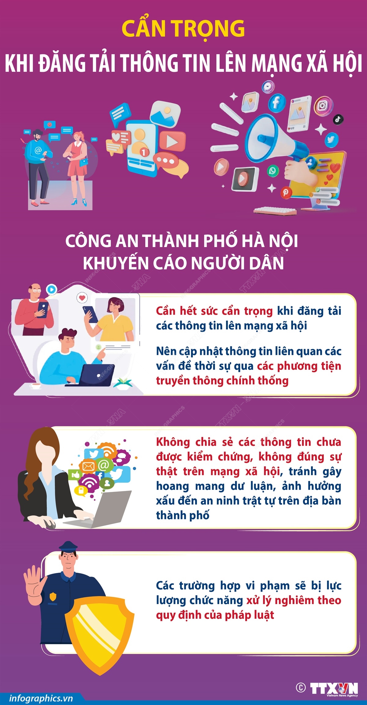 Thời gian gần đây, trên mạng xã hội xuất hiện khá nhiều chủ tài khoản đăng tải thông tin sai sự thật gây hoang mang dư luận, thậm chí có nhiều trường hợp đăng tải thông tin không chính xác về chủ trương, quy định pháp luật của Nhà nước. Công an thành phố Hà Nội khuyến cáo người dân cần hết sức cẩn trọng khi đăng tải các thông tin lên mạng xã hội. Người dân nên cập nhật thông tin liên quan các vấn đề thời sự qua các phương tiện truyền thông chính thống.